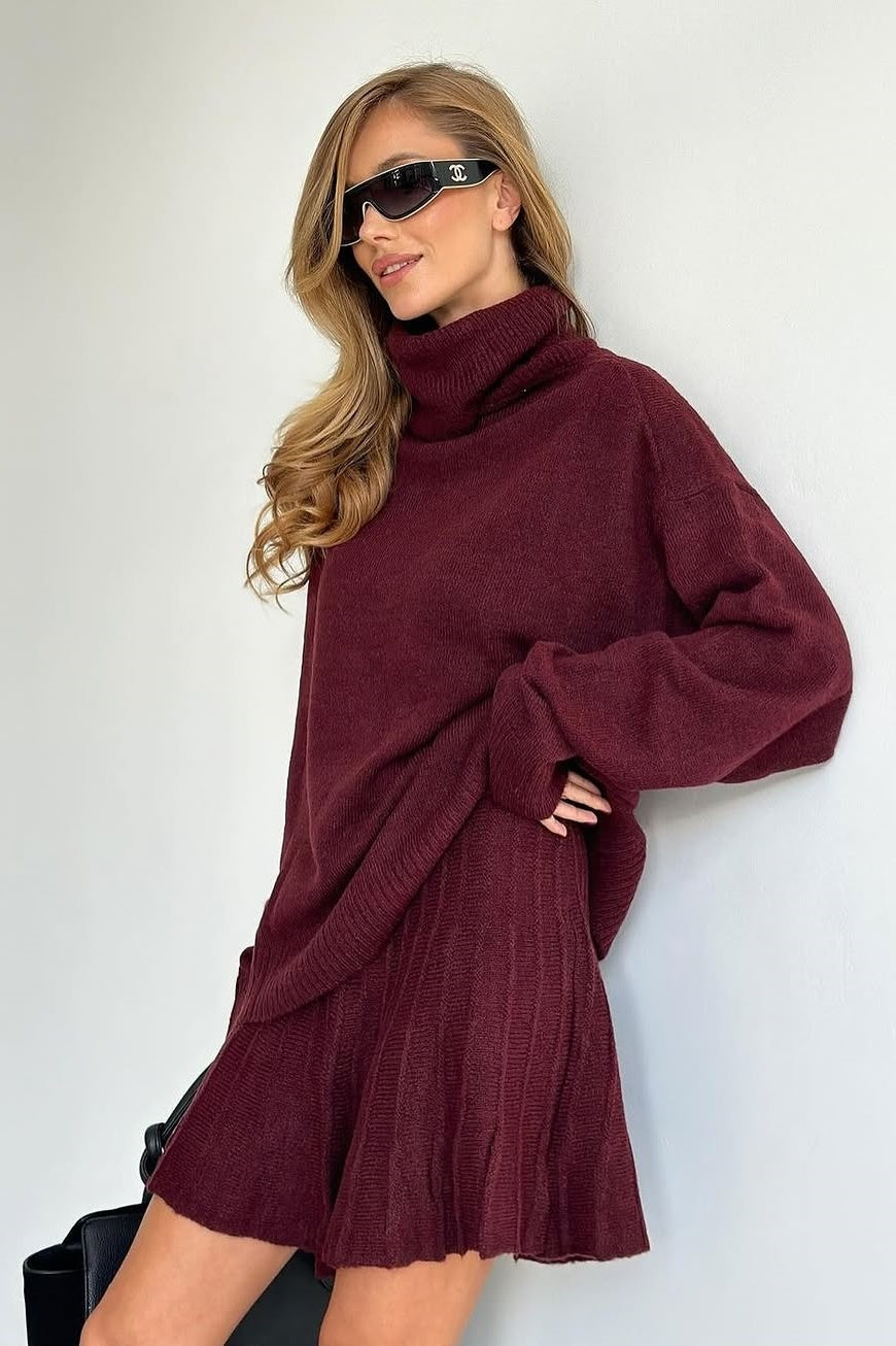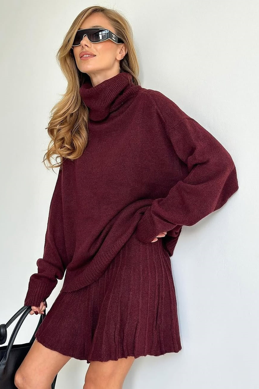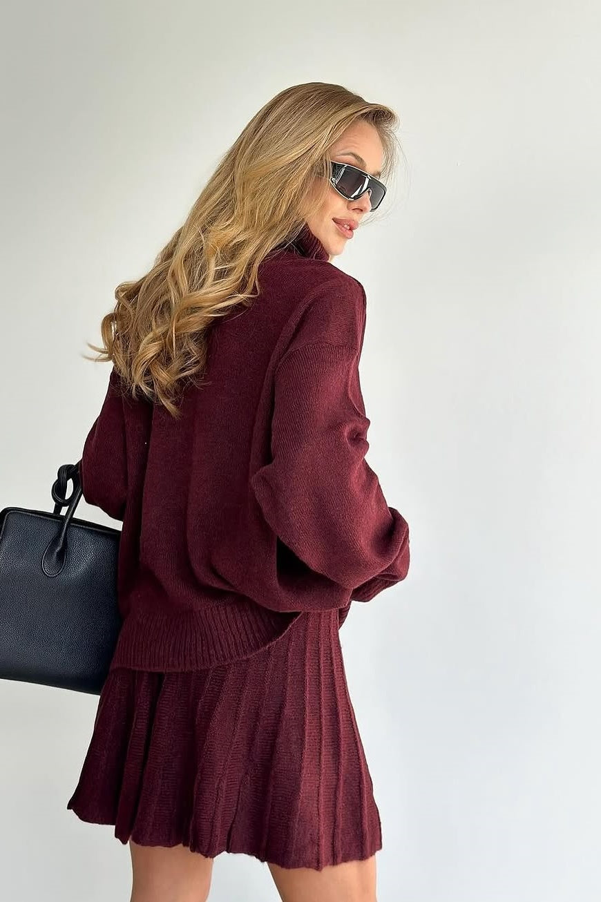 Turtleneck Collar. Long Sleeve. Pleated Details. Mini Skirt.