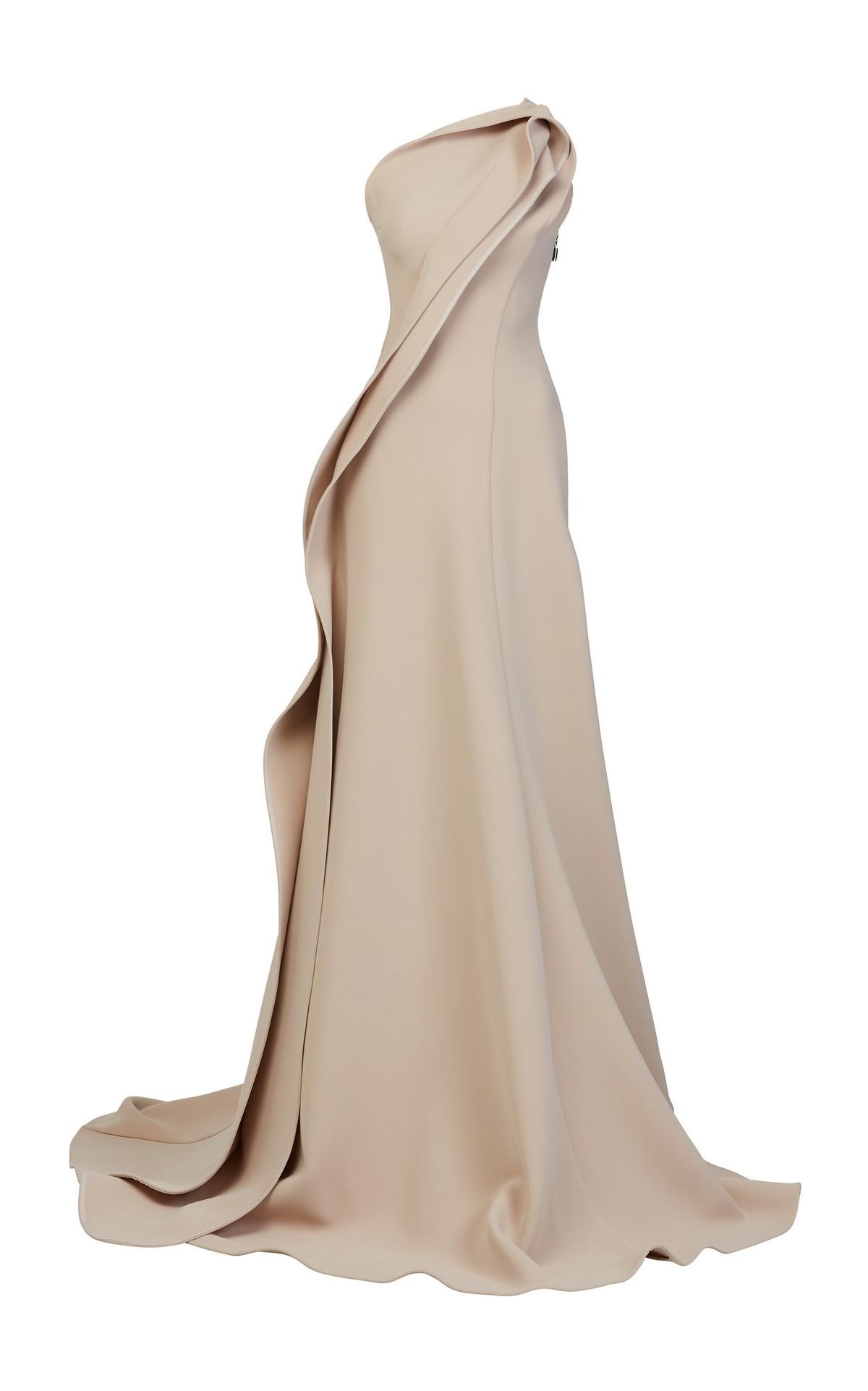 This one-shouldered dress combines dramatic lengths and fluid design lines to create a monumental silhouette. elongating the female form.
