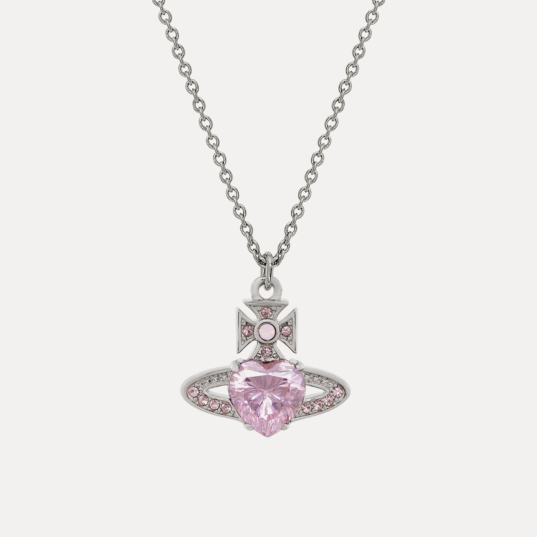 This necklace features a heart-shaped gemstone in the centre of the design. complete with a crystal-encrusted Saturn ring.