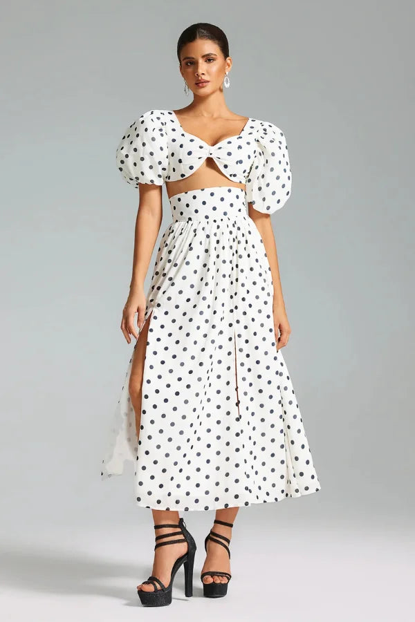 Step into timeless charm with our Atarrah Polka Dot Skirt Set. This ensemble effortlessly combines classic polka dots with modern flair. offering a versatile addition to your wardrobe. Crafted with premium materials. the set ensures comfort and style in equal measure. Whether you're off to a brunch date or a casual outing with friends. this outfit exudes confidence and sophistication. Embrace the allure of polka dots and make a statement wherever you go.