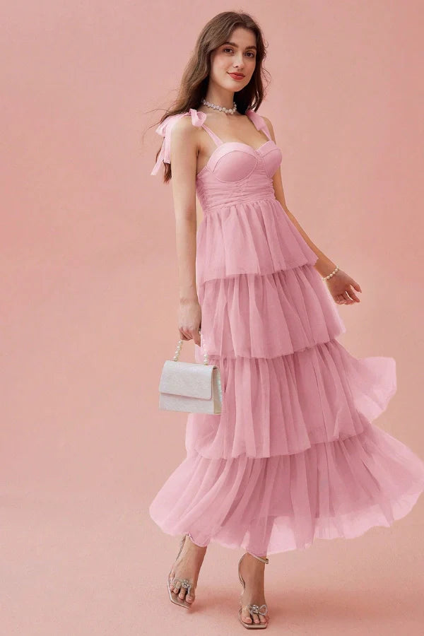The Bellara dress exudes timeless elegance with its solid color and layered design. Featuring a sleeveless silhouette. this dress is adorned with a charming bow-tie detail. adding a touch of sophistication. Its flowy layered structure creates effortless movement. making it perfect for weddings. cocktail parties. or any special occasion. Pair the Bellara dress with subtle accessories and heels for a polished and graceful look.