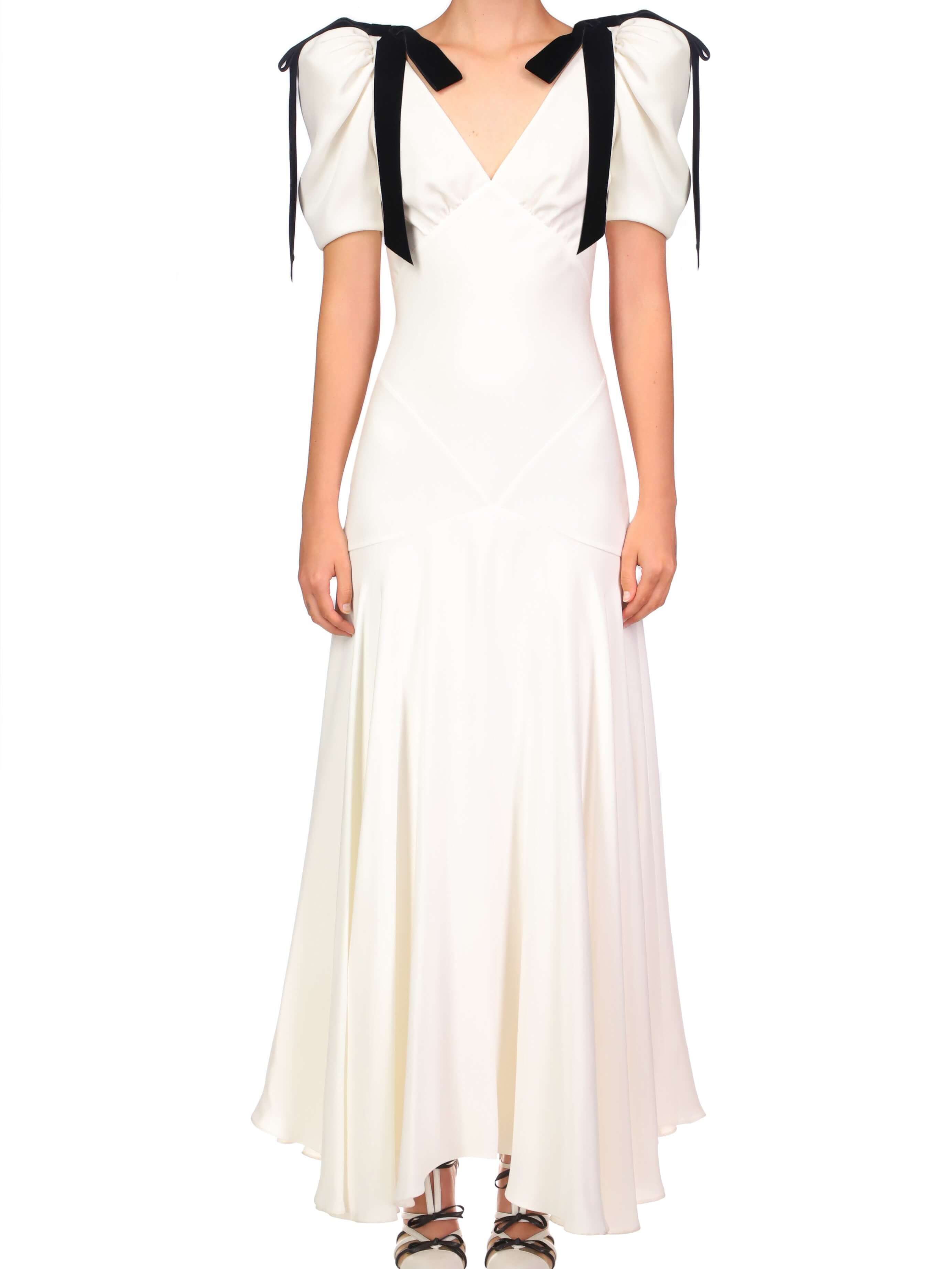 It has black velvet bows that tie over the puff shoulders. The empire waistline gently flares to a maxi length.