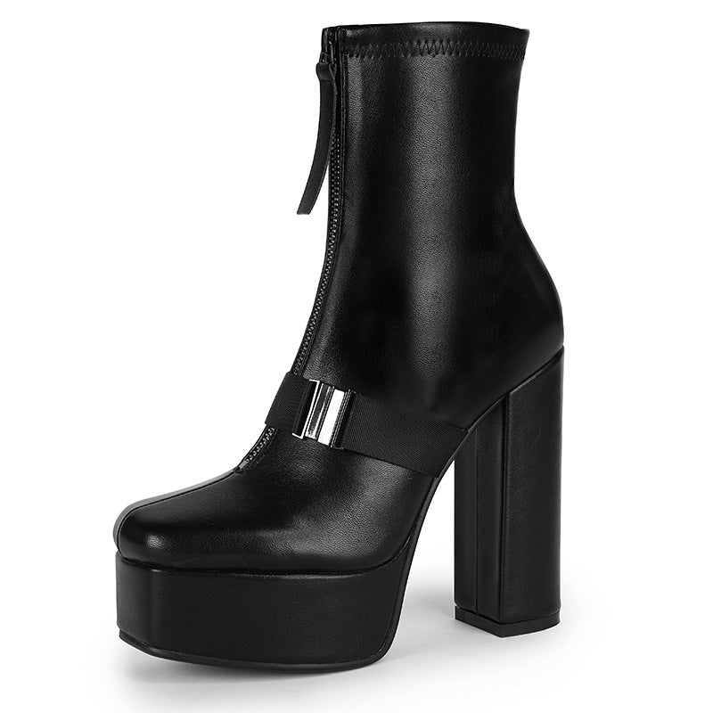 nA Black Strap adds a subtle edgy touch to these 90s inspired black platform ankle boots. Front Zipper provides ease of insertion and removal.