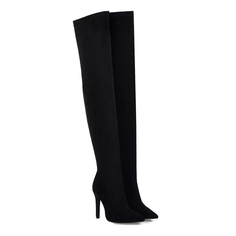 You are bound to turn heads in this sumptuous soft stretch suede over-the-knee boot that will wrap your leg like a glove. This boot will fit most legs as it has a good amount of stretch. This style goes well over skinny jeans or with your favorite skirt.
