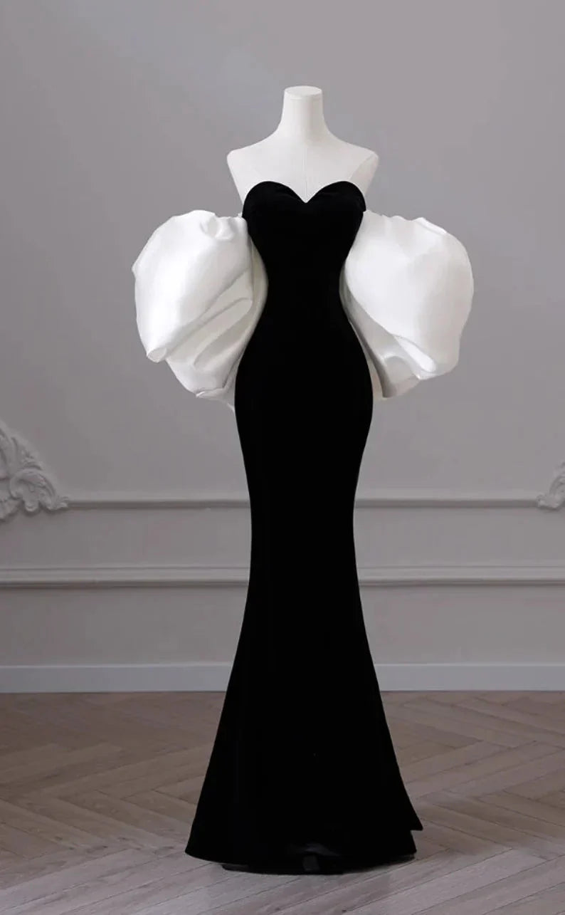 The Black Velvet Tube Mermaid Dress is a strapless evening gown with a fitted bodice and a full skirt.