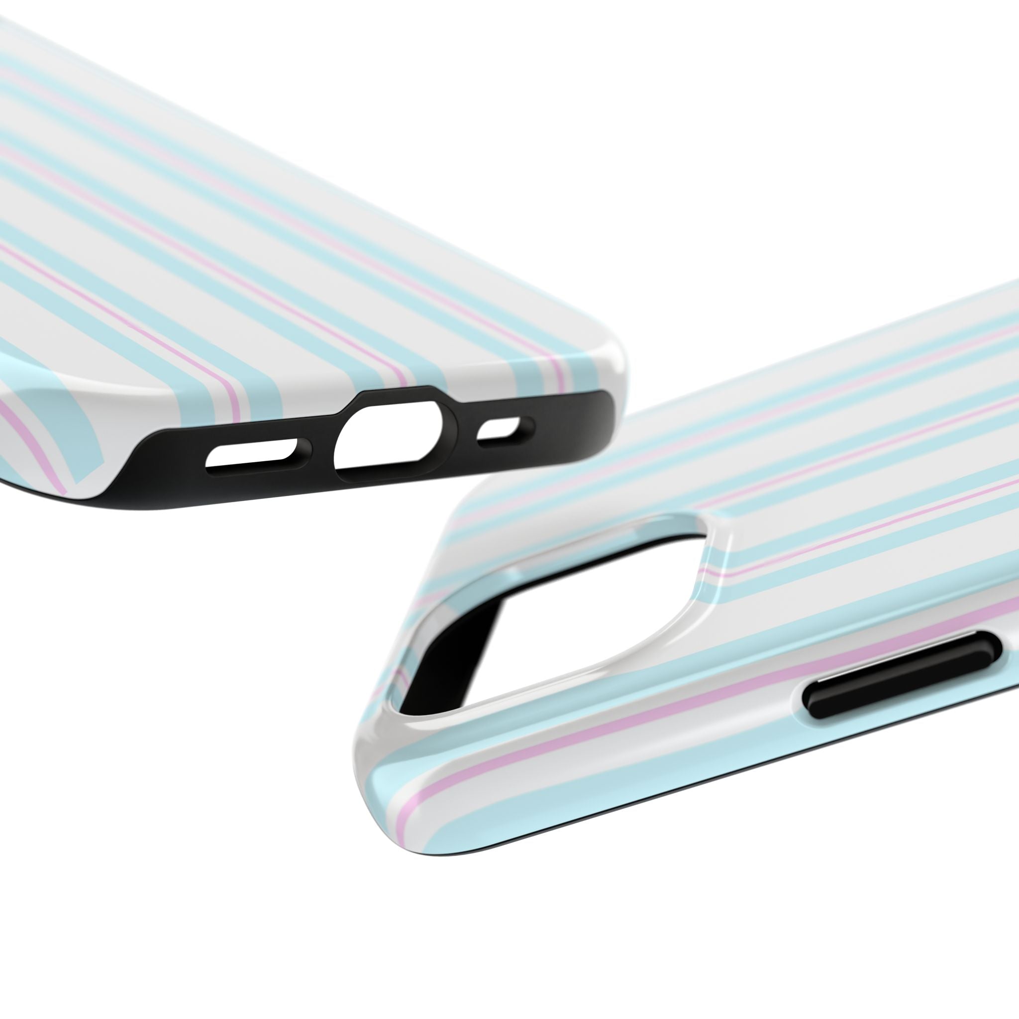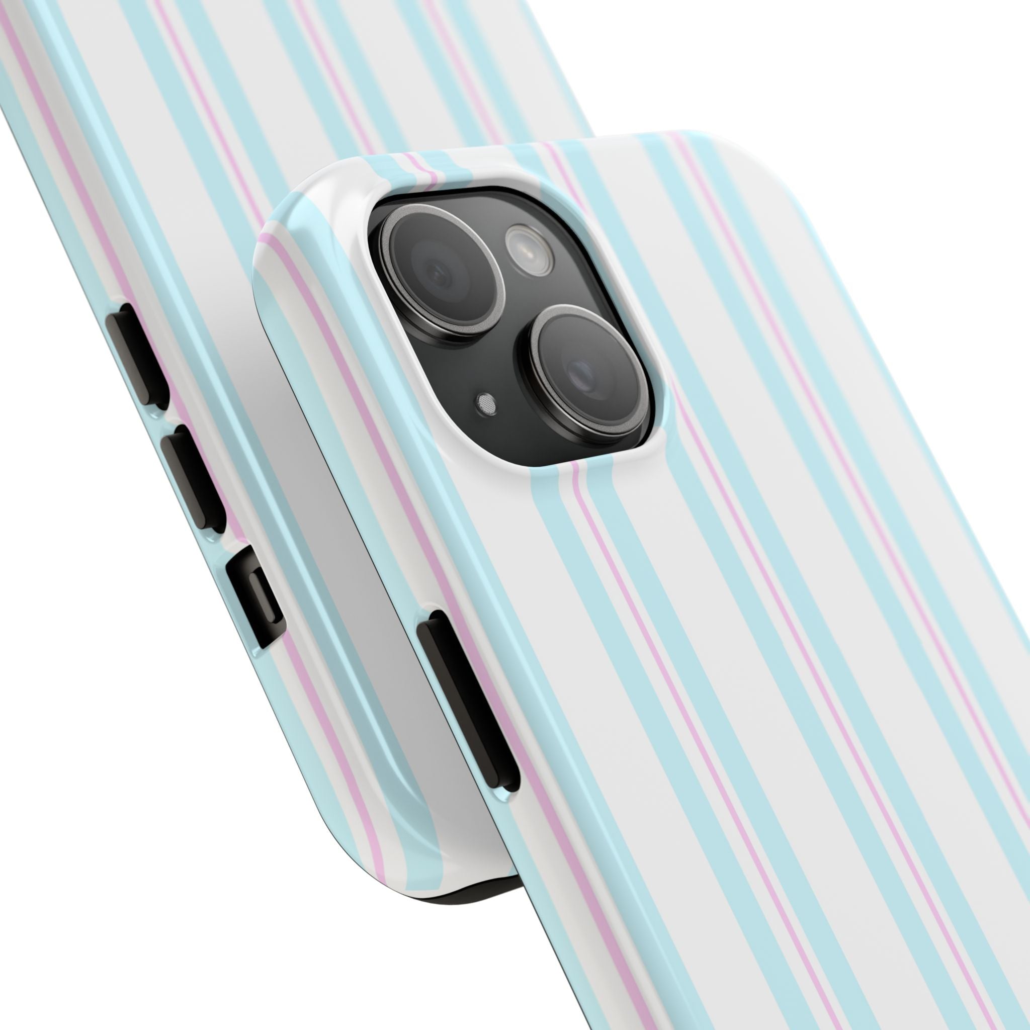 This pastel-striped iPhone case brings together everything we love about soft girl tech. Korean minimalism. and preppy aesthetic style. Designed in a dreamy combination of baby blue and pastel pink vertical stripes. it instantly upgrades your phone with a cute. clean look.
