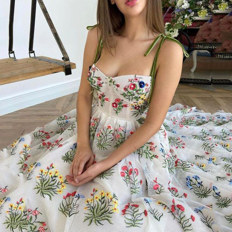 Design: Flower Embroidery. Bodice. Spaghetti. Tie Up. Mesh Overlay. Flowy. Floral Lace. Formal. Maxi Length and Trendy Style.