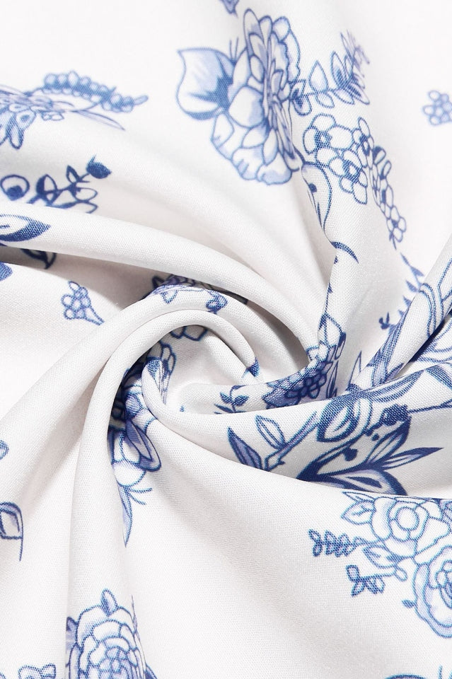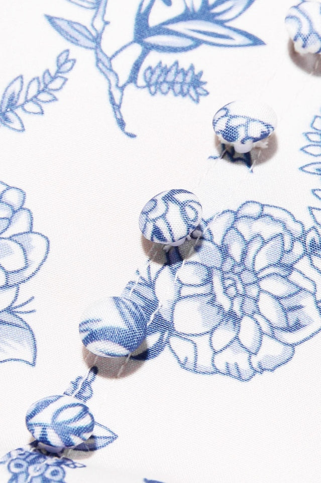Our 'Brigitte' mini dress in a gorgeous English porcelain print is ultra feminine with a vintage feel. It's cut from a linen-cotton blend so it's light and airy. It has a corseted bodice for a cinched waist and a plunging shaped bust for gentle support. The delicate button detailing and flouncy mini skirt adds to the girlish feel. especially the soft tulle underskirt.