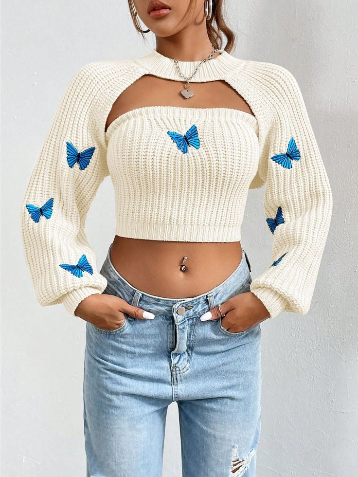 This outfit set features a knitted crop tube top and a shrug with butterfly pattern embroidery.