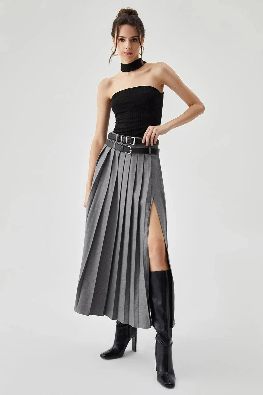 Turn heads with the Caitlyn Pleated Split Maxi Skirt �a modern twist on classic elegance. The graceful pleats and stylish split create a look that's both trendy and timeless. Perfect for any occasion!