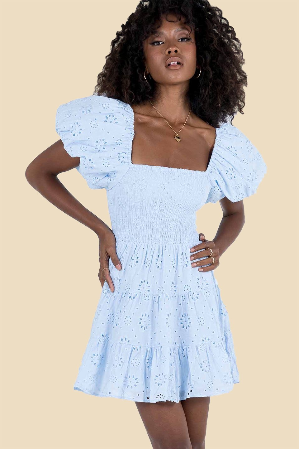 Carol Shirred Embroidered Lace Cotton Mini Dress