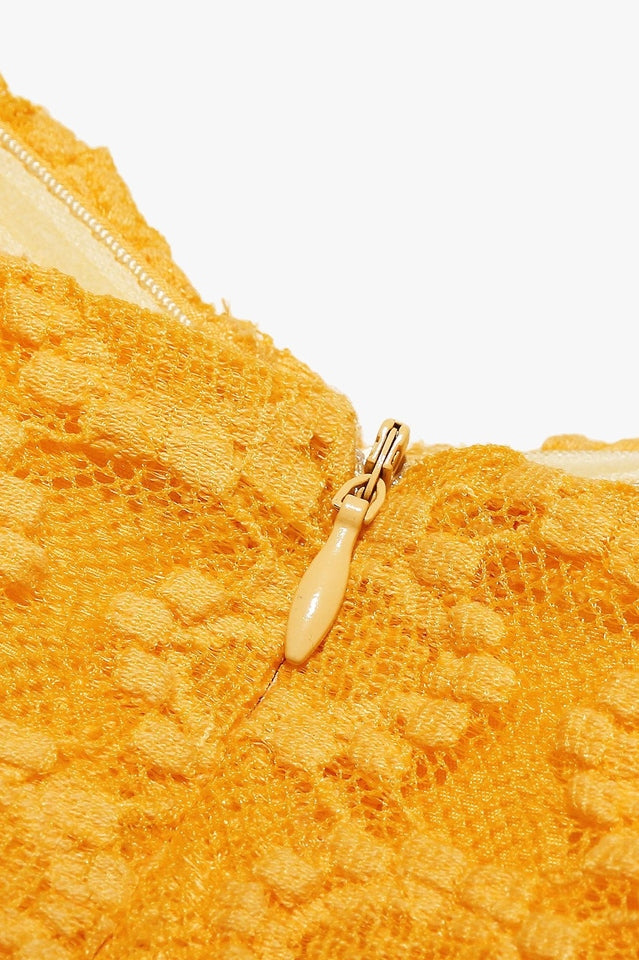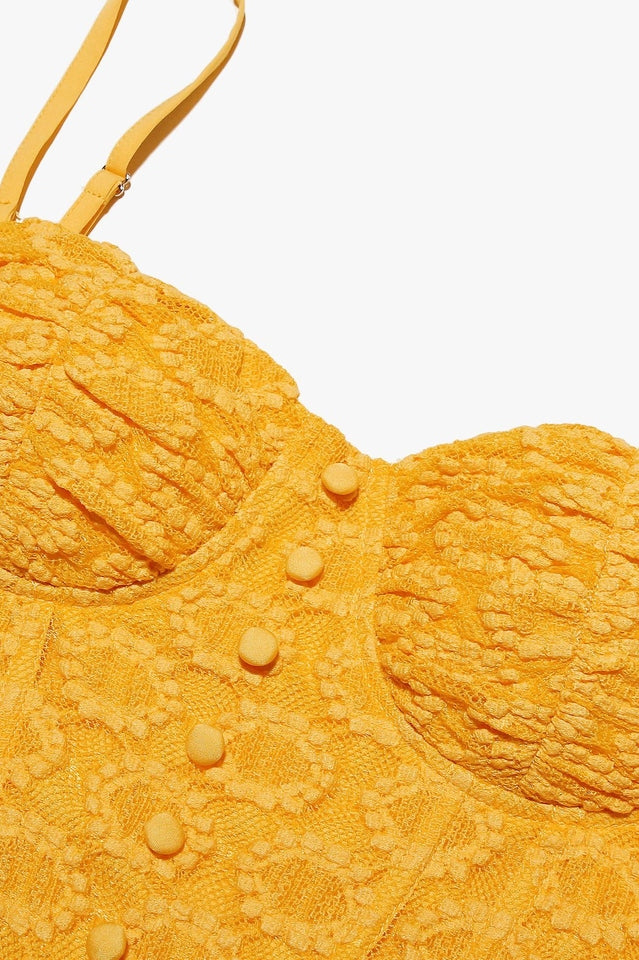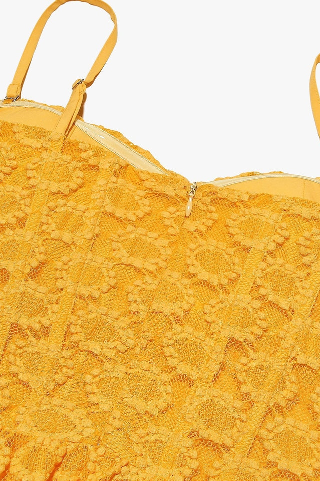 Carolina Apricot Lace Corset Mini Dress is cut from stretch lace and the pretty daisy design enhances the beautiful texture. It has a corseted bodice and underwired cups to cinch and shape your figure to perfection. The delicate button detailing and floaty mini skirt adds to the girlish theme this season. The skirt of 'Carolina' is heavily layered with the softest tulle for the prettiest puff shape at the hips.