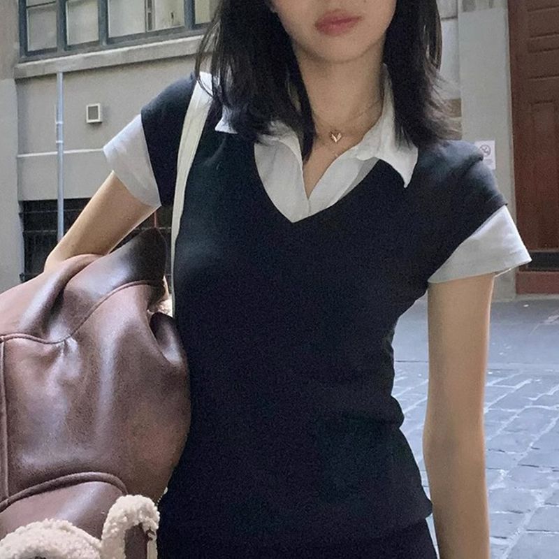 The fake two piece shirt features fake two piece tee top with fake collar and fake sleeves. The collared short sleeve tee can be multi styled and fit every body type. flattering on all body types. paired with any shorts. skirts. jeans & pants. get yourself a trendy outfit for street style. beaches and travel.