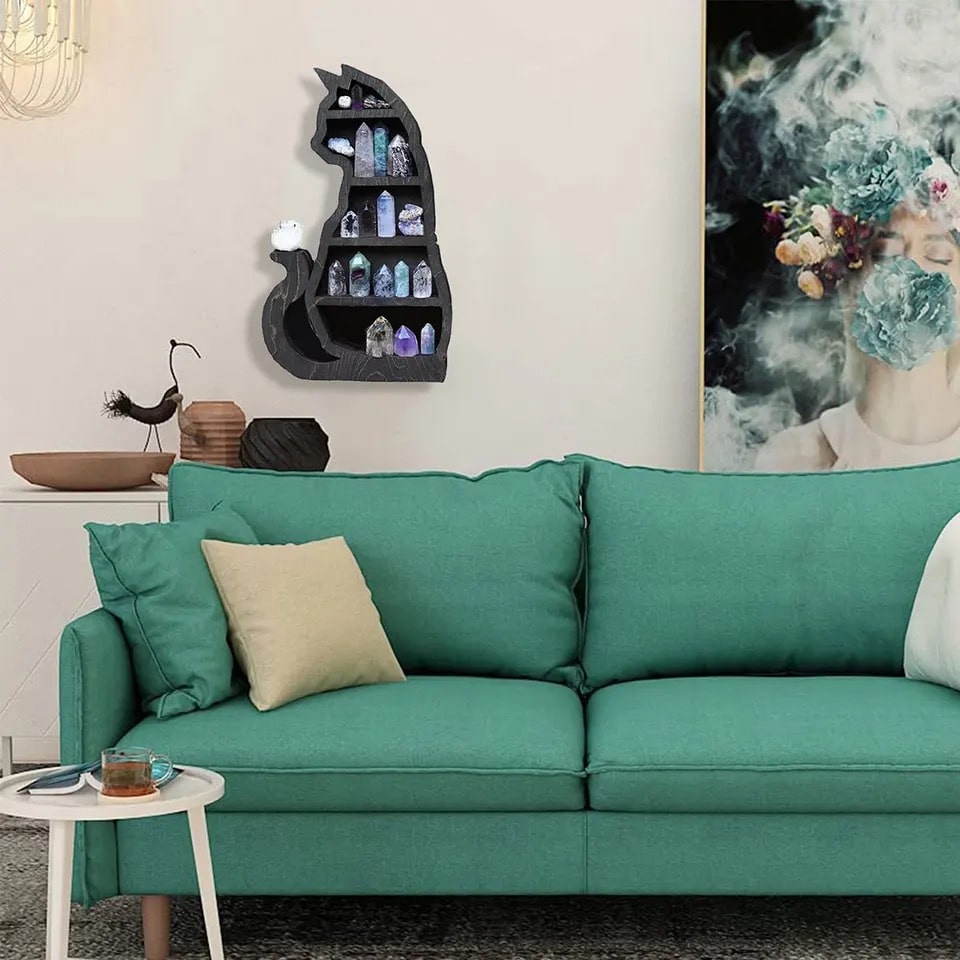 Whether you're setting up a witchy altar or simply looking for a decorative shelf to enhance your space. this black cat crystal shelf is a versatile and elegant addition to any home. It's designed to hang easily on the wall. adding both style and functionality. Ideal as a unique gift for spiritual enthusiasts or for anyone looking to create a mystical vibe in their home.