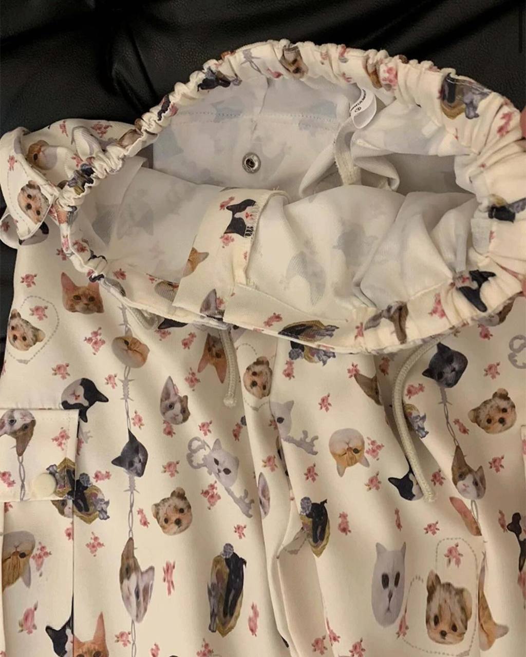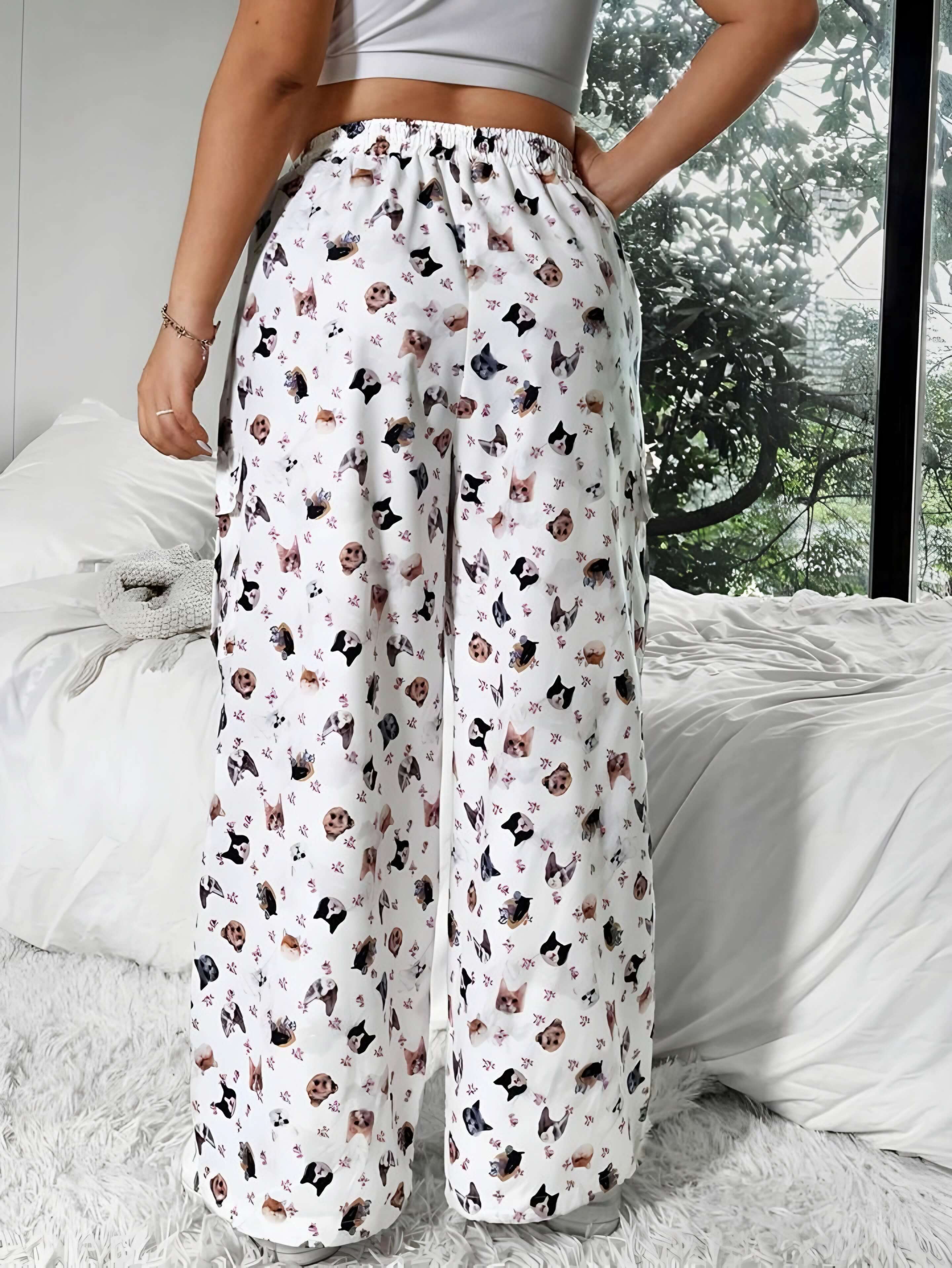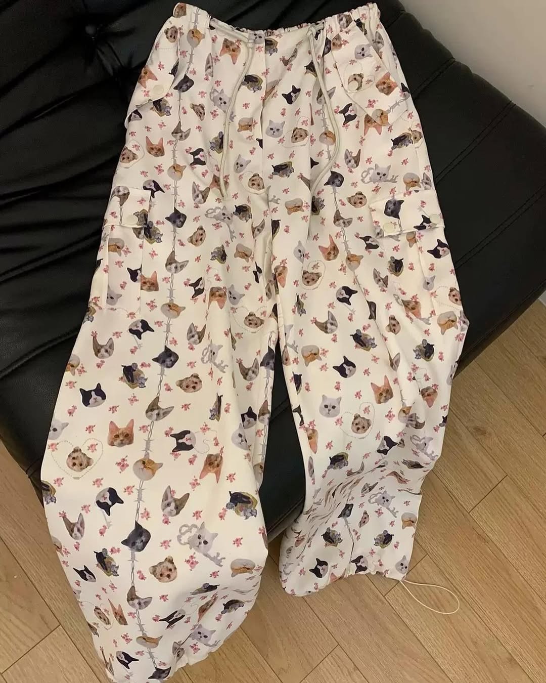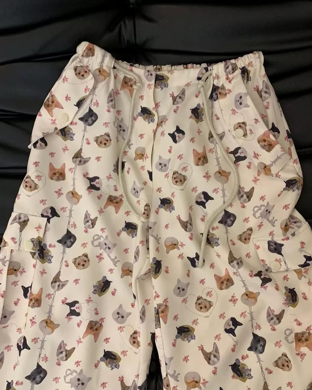 These cargo pants feature a playful and unique print of various cat and dog faces. adding a fun and whimsical touch. The relaxed fit and wide leg design ensures maximum comfort.