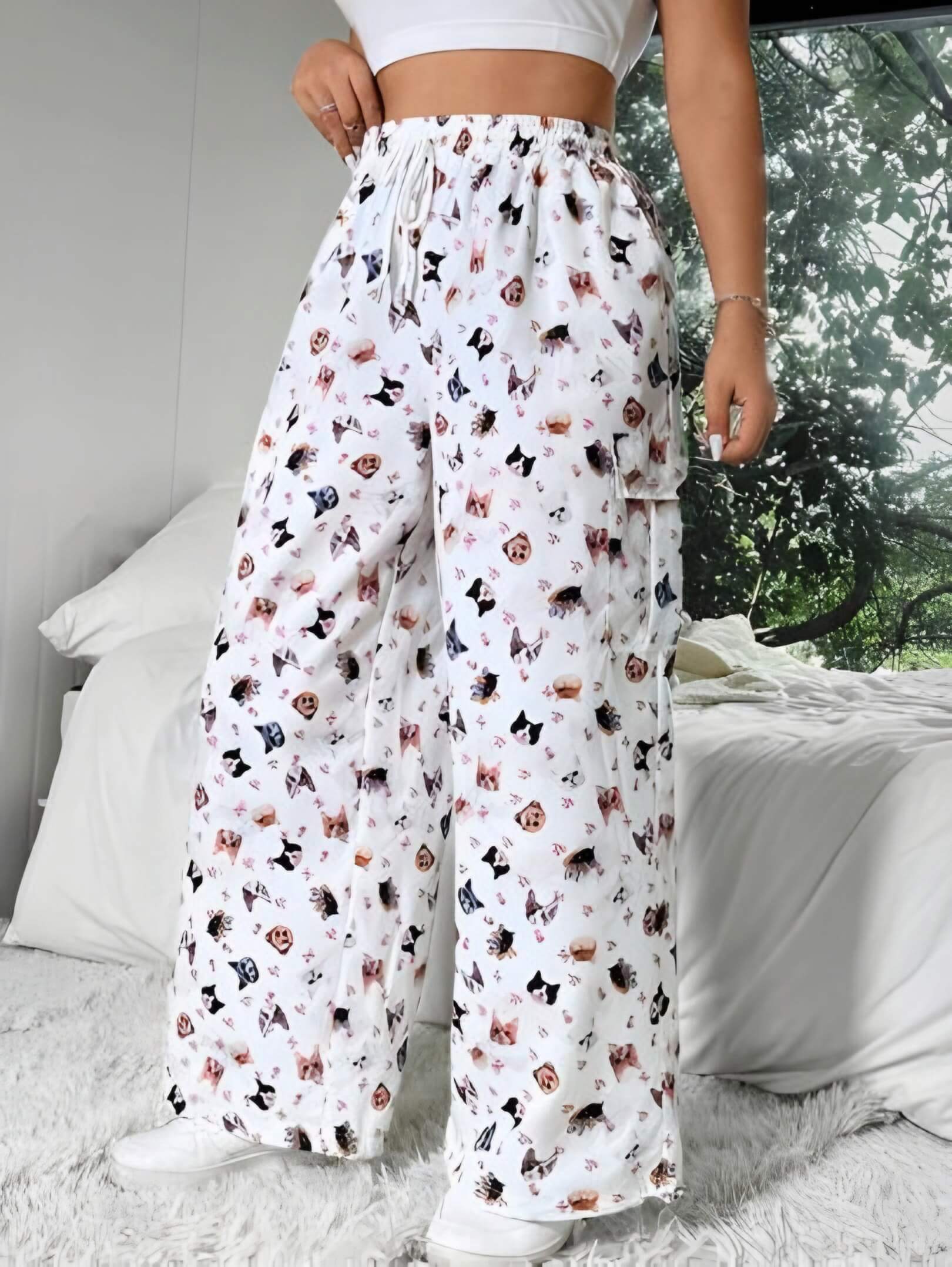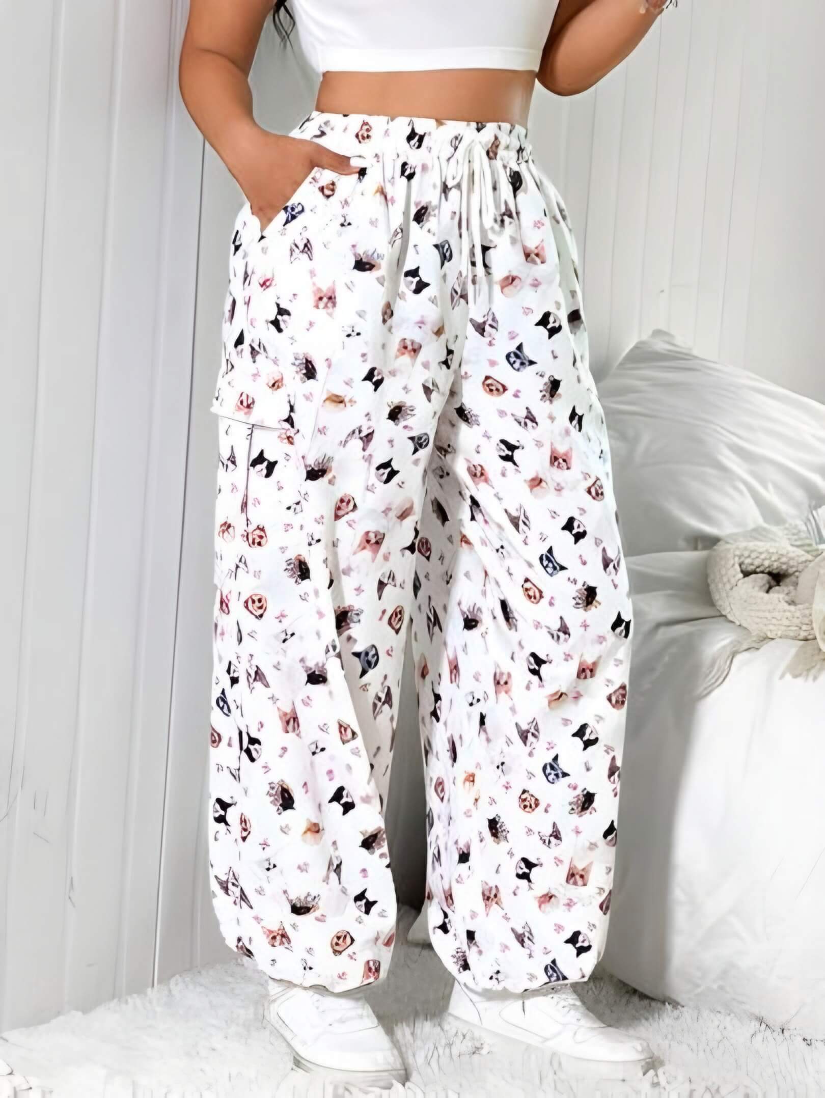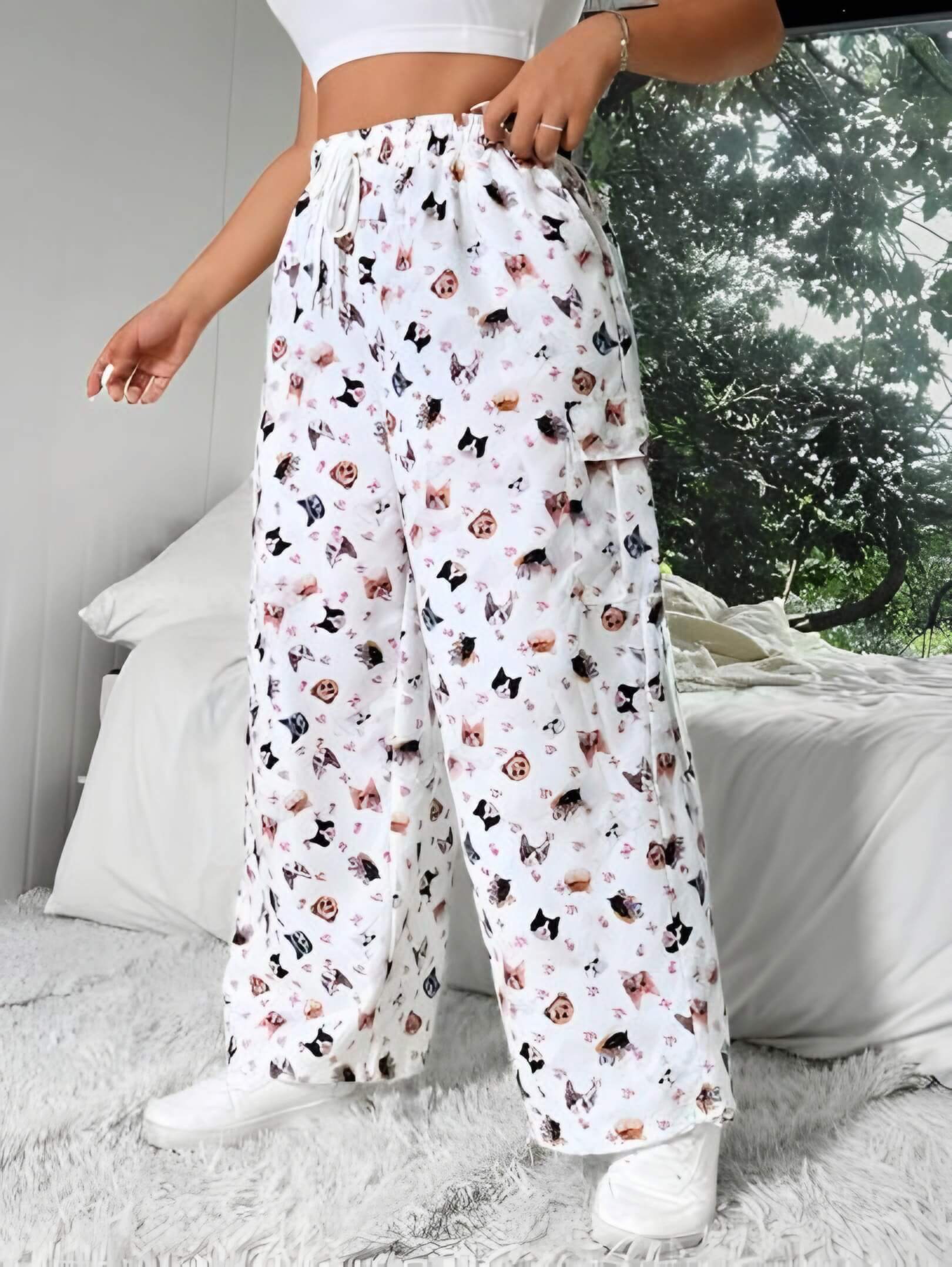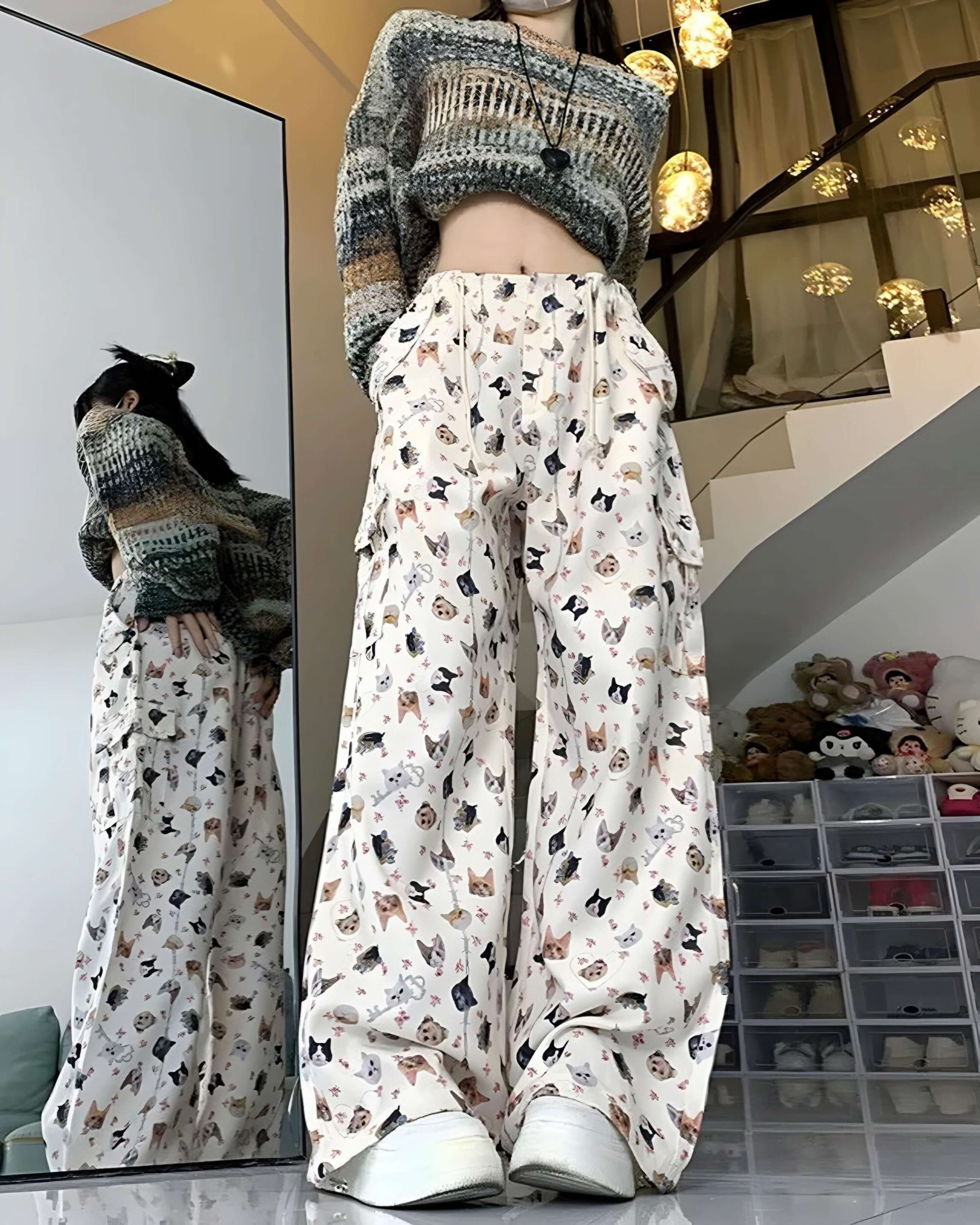 These cargo pants feature a playful and unique print of various cat and dog faces. adding a fun and whimsical touch. The relaxed fit and wide leg design ensures maximum comfort.