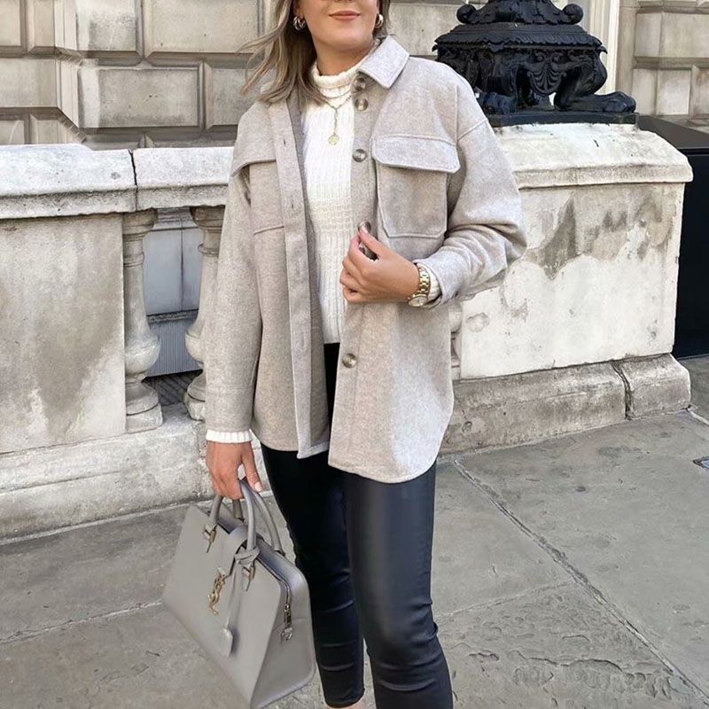 The Brand style faux Wool shirt jacket features plain color. wool blended. boyfriend style. extra large sizes available. work cargo styles. long sleeves. patch pockets. front flap pockets with flap closure. front button up and confident cargo style design. One of the womens big pocket fleece shacket jacket for any body type. for jeans & pants and for street style & casual outfits.