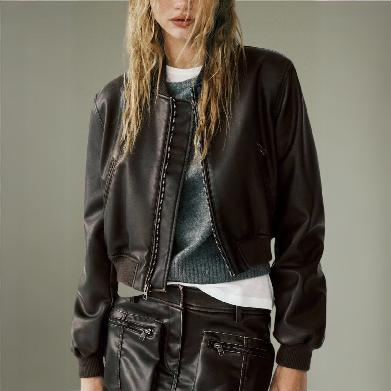 Bomber jacket with a round neck and long sleeves. Ribbed trims. Front pockets. Front zip fastening. From premium vegan leather. provides an ethical substitute without sacrificing the aesthetic.