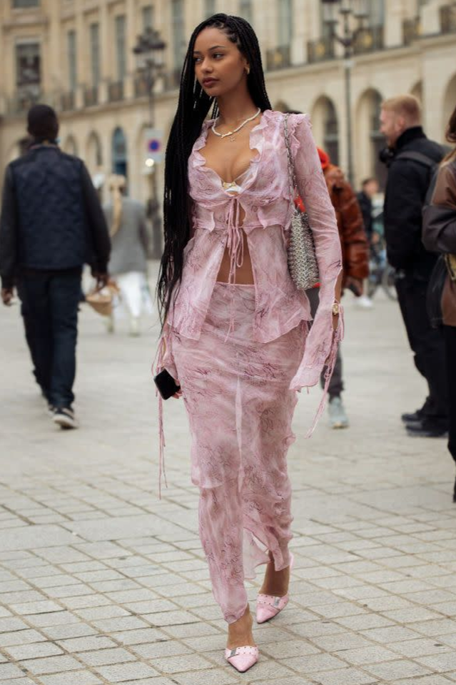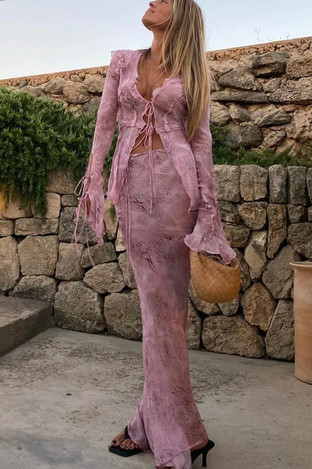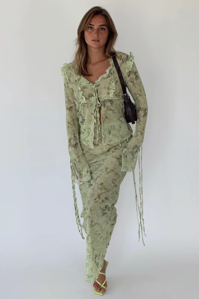 Lightweight frilled hem maxi skirt with adjustable hip tie closure. Made of mesh fabric.