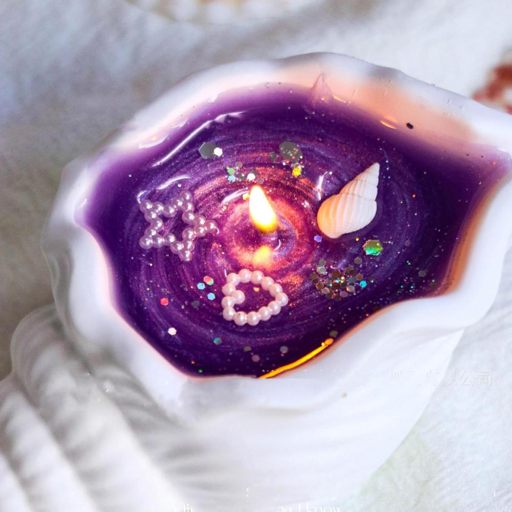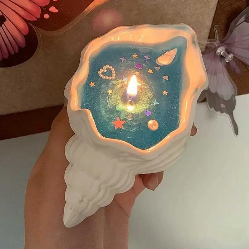 This unique conch seashell candle boasts sparkling wax and is adorned with starfish and pearl decorations. all carefully hand-poured for a truly unique and charming addition to your decor.