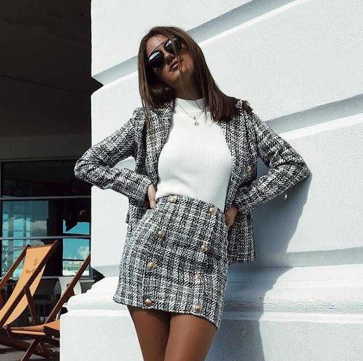 The?classic double-breasted?grey tweed brazer?suit?for women?features cool tough-luxe edge.?double?breasted button closure. 2 front flap pockets.?embossed?glossy golden metal hardware and classic?lapel collar.?This?business?plaid skirt and blazer?is?brand?design and?nice?fitting. ?ladies?black and white plaid blazer?for any body type. for?interview. work and?any official events &?separatedly paired with your wardrobe .