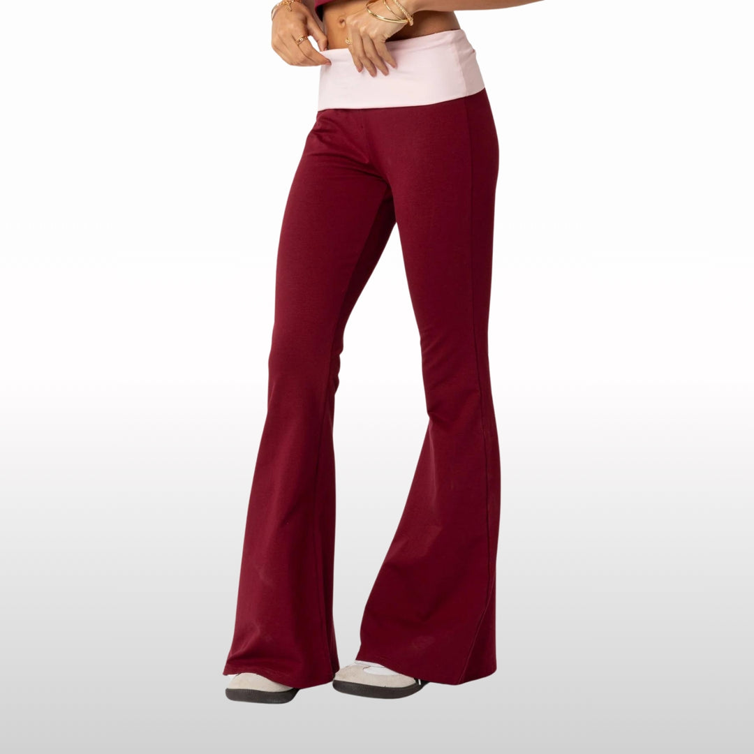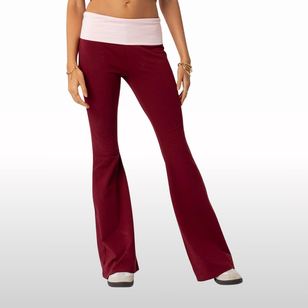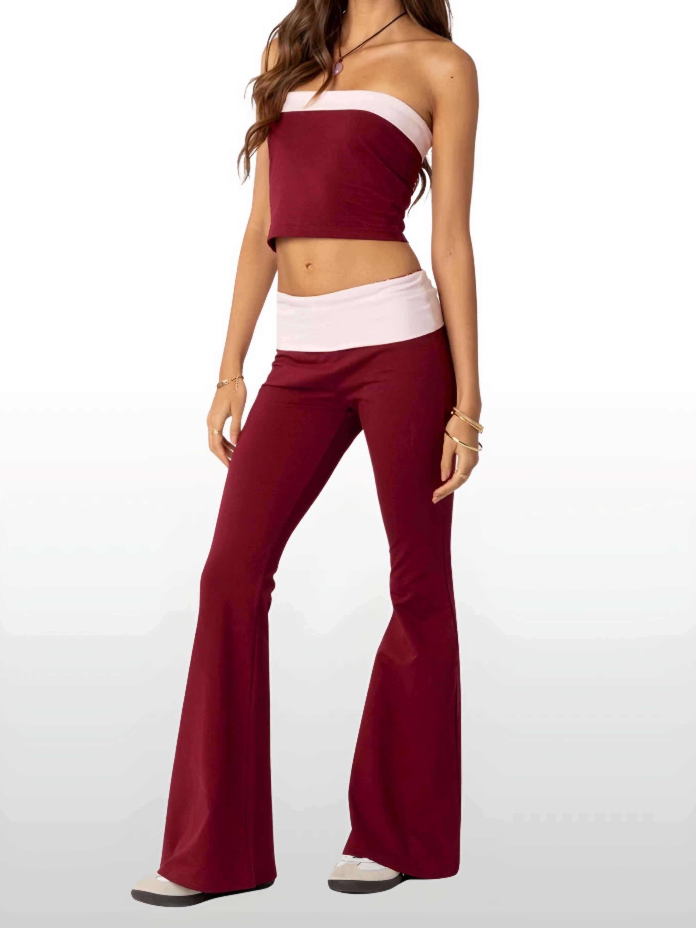 This two-piece outfit consists of a burgundy and white tube top with matching burgundy flared pants.