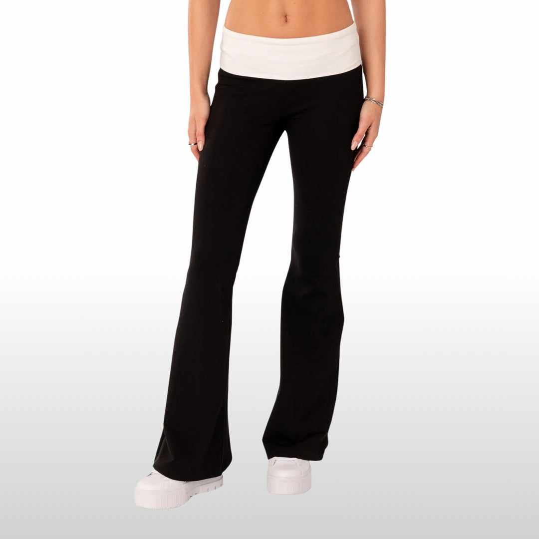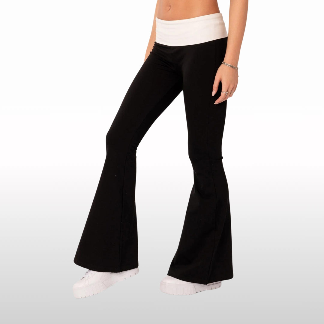 The tube-style top wraps around the upper body without straps. The pants are fitted at the waist and hips. and flared out significantly from the knee down. creating a bell-bottom style.