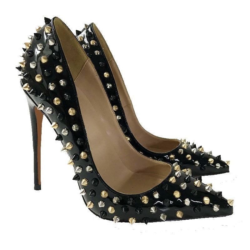 A mix of black. silver. and gold spikes form an edgy halo around the low-cut vamp and slender wrapped heel of a beautiful pointy-toe pump that perfectly mixes punk rock and posh.