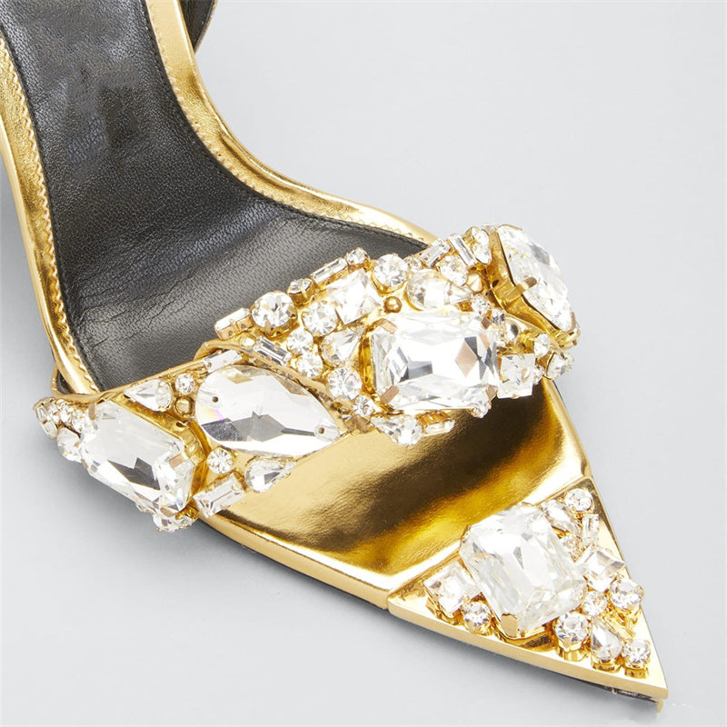 Celebrate your special occasion with the finest luxury shoes. These Crystal-embellished metallic vegan leather sandals. The Wrap-around ankle ties crystal sandals are addition to these elegant sandals.