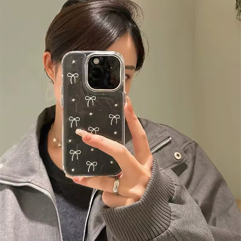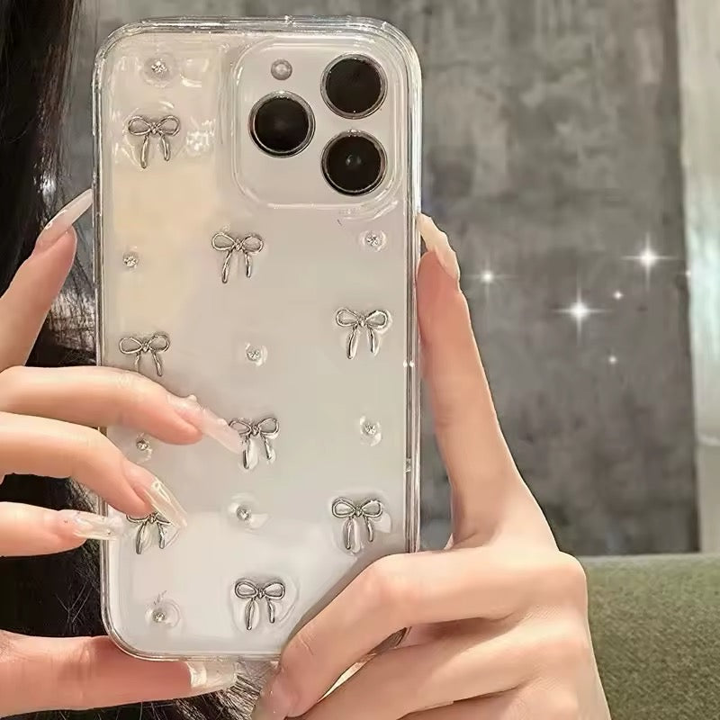 Designed for iPhone 16. 15. 14. 13. 12. 11 Pro Max. SE. XR. XS. and more. this shockproof anti-drop sleeve provides edge-to-edge protection while maintaining a sleek and slim profile. The premium silicone and epoxy shell offer scratch resistance. fingerprint protection. and a non-slip grip. making it perfect for everyday use. Whether you're into coquette aesthetics. glitter fashion. or kawaii accessories. this trendy silver bow iPhone case is a must-have for stylish tech lovers. Perfect as a gift for girls. best friends. and fashion-forward individuals. this premium clear cover will make your phone stand out with a dazzling finish.