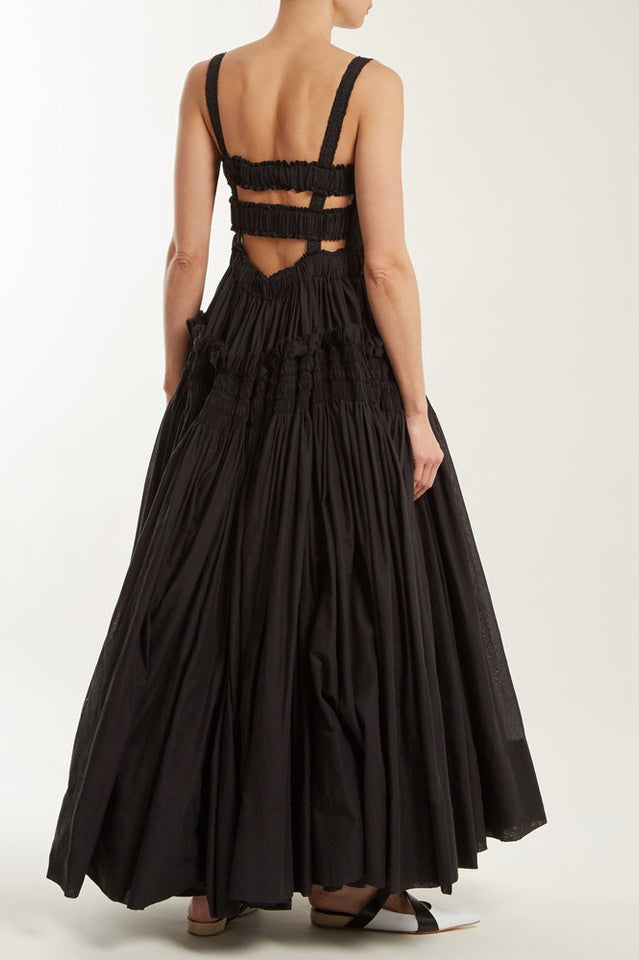 The Larry bridal dress. made in a light cotton voile. has a hand-smocked bodice and a full skirt with additional hand-smocked panels at the sides. The dress has an open back and frill details at the neck and side panels.