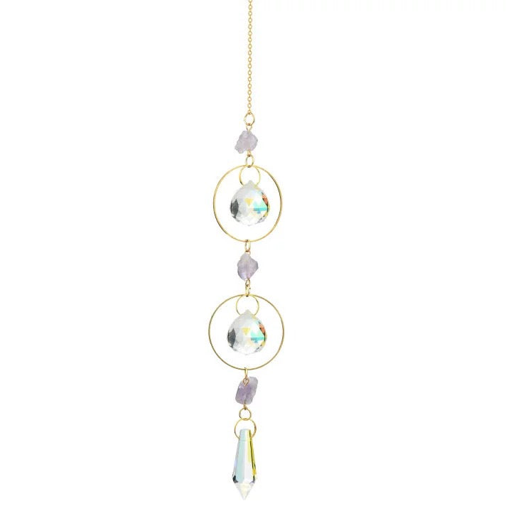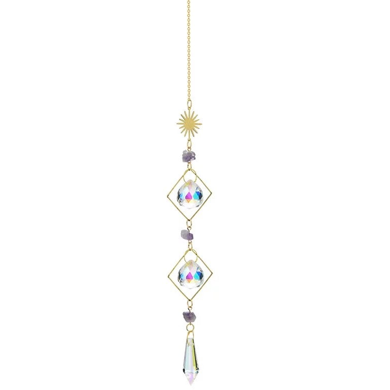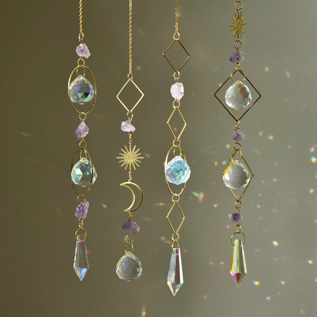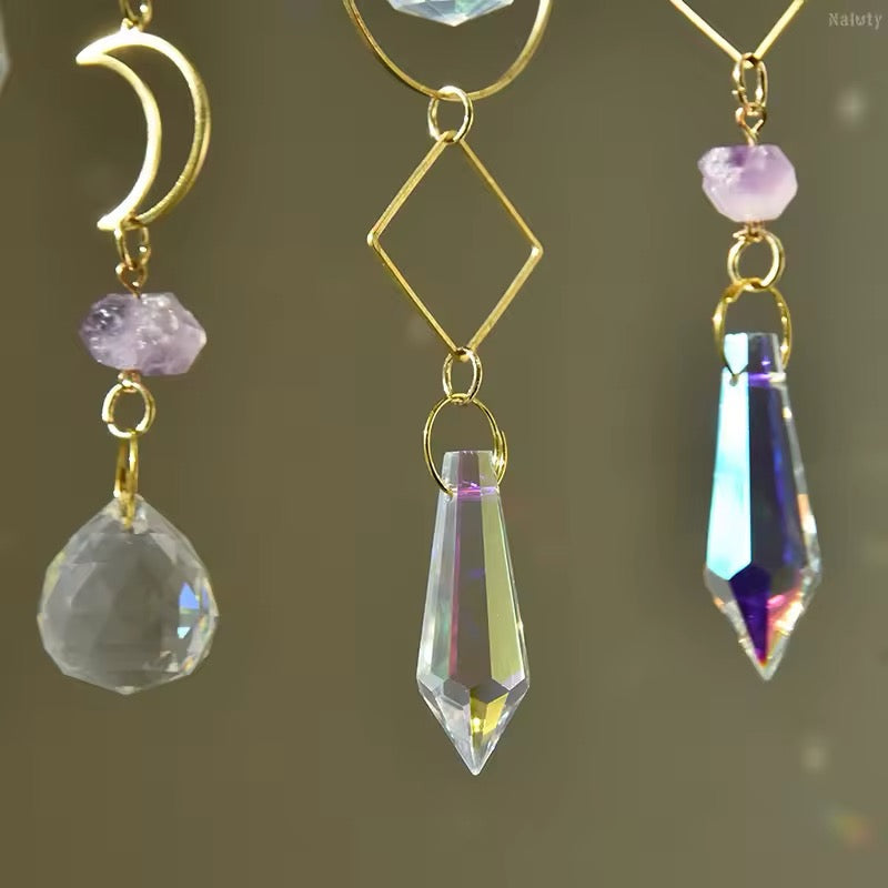 Illuminate your space with this Crystal Moon Suncatcher. a stunning hanging prism that transforms sunlight into vibrant rainbows. Designed with a golden chain and premium crystal pendants. this boho-inspired sun catcher adds an elegant touch to windows. cars. and outdoor spaces. Featuring an amethyst crystal and rainbow-making prisms. this piece not only enhances your home decor but also brings a calming. healing energy to your surroundings.