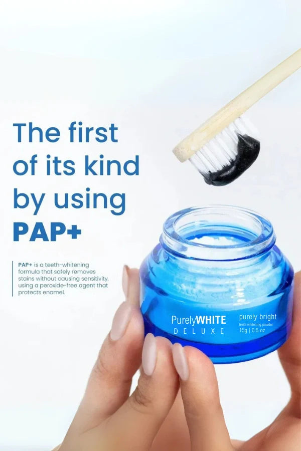 Say hello to the next-gen Teeth Whitening Powder. powered by PAP+. the game-changing. peroxide-free formula that lifts stains without sensitivity or enamel damage. Developed by dentists for safe. effective. and worry-free whitening. it not only gives you a radiant smile but also supports overall oral health.