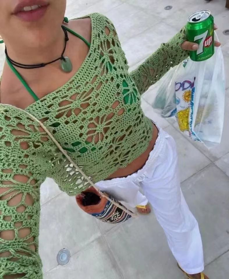 This ganni crochet top comes in a soft. see thru flower knitted blouses. round neck. handcrafted crochet blouses. The crochet summer tops for women is popular for warm weather.