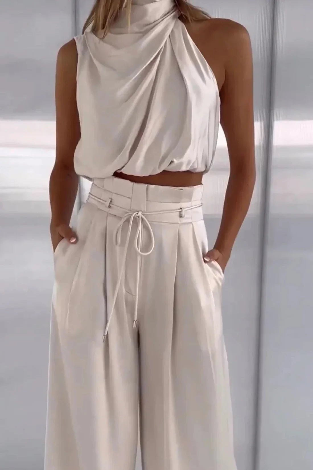 This sleeveless top and wide-leg pants summer set exudes effortless chic with its clean lines and relaxed fit. The sleeveless top features a flattering V-neckline. while the wide-leg pants provide comfort and style. making it the perfect ensemble for a summer day out.