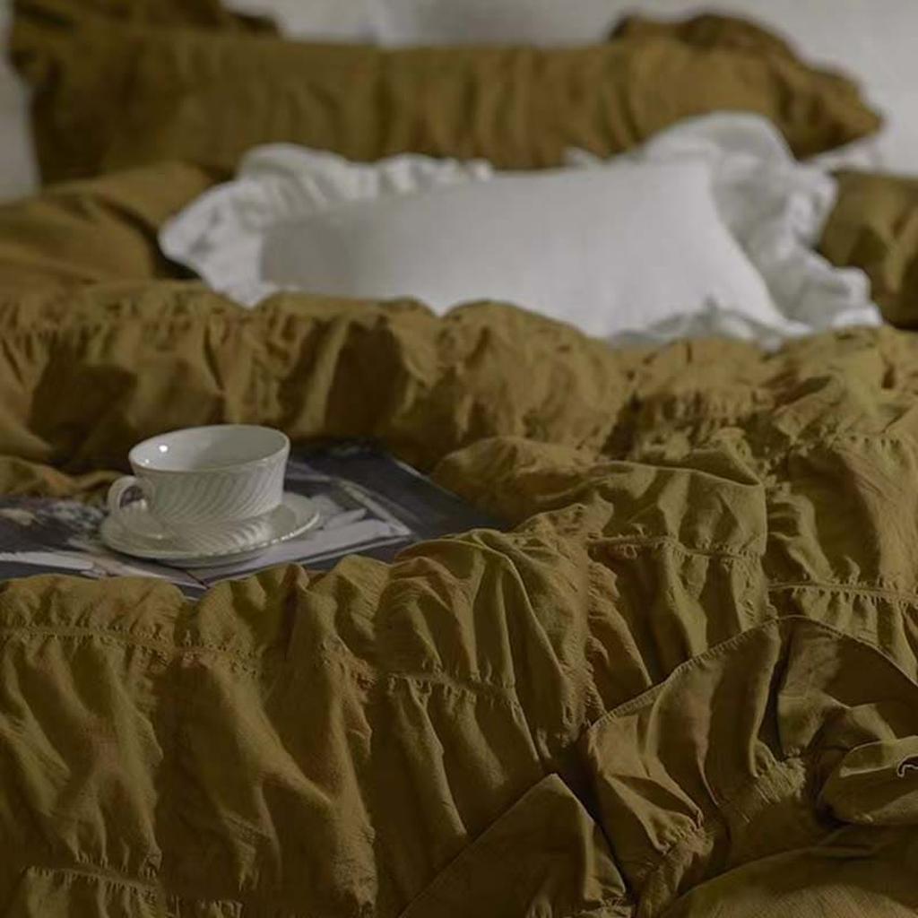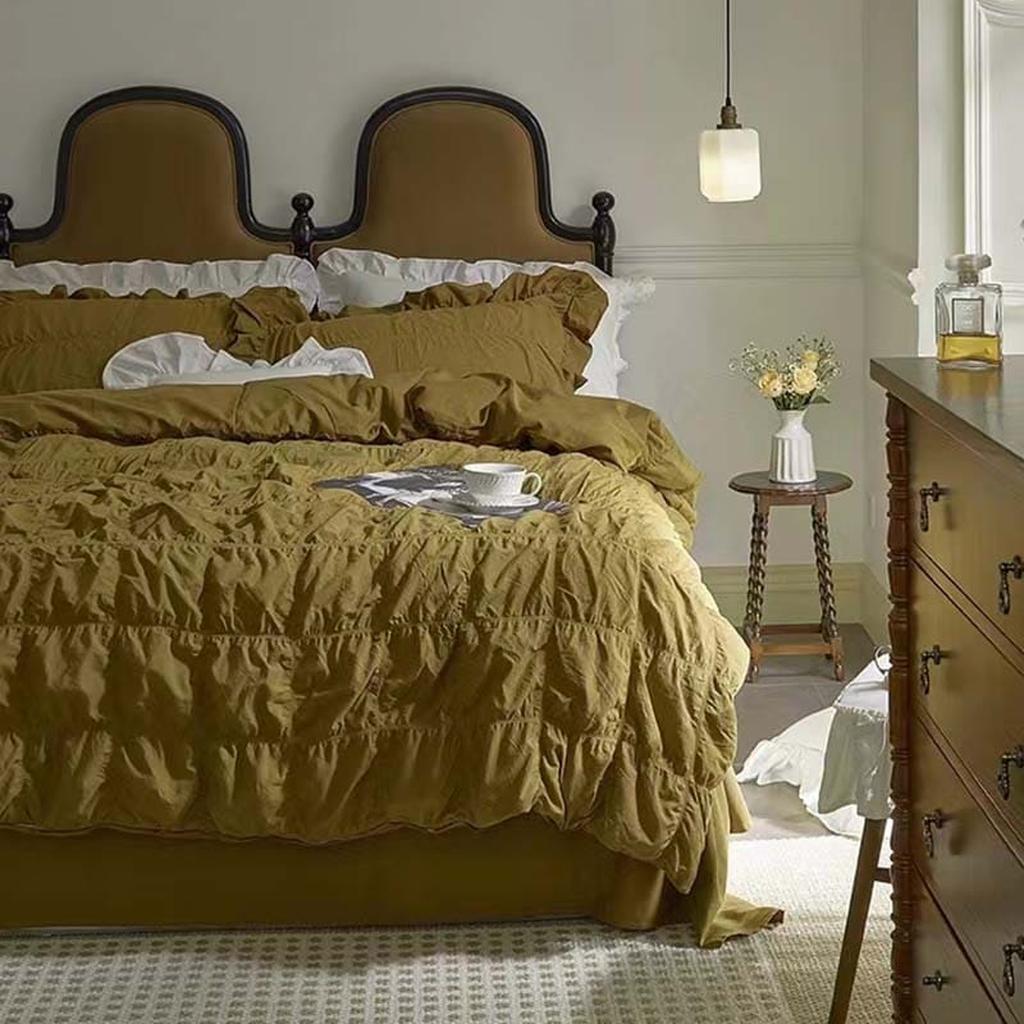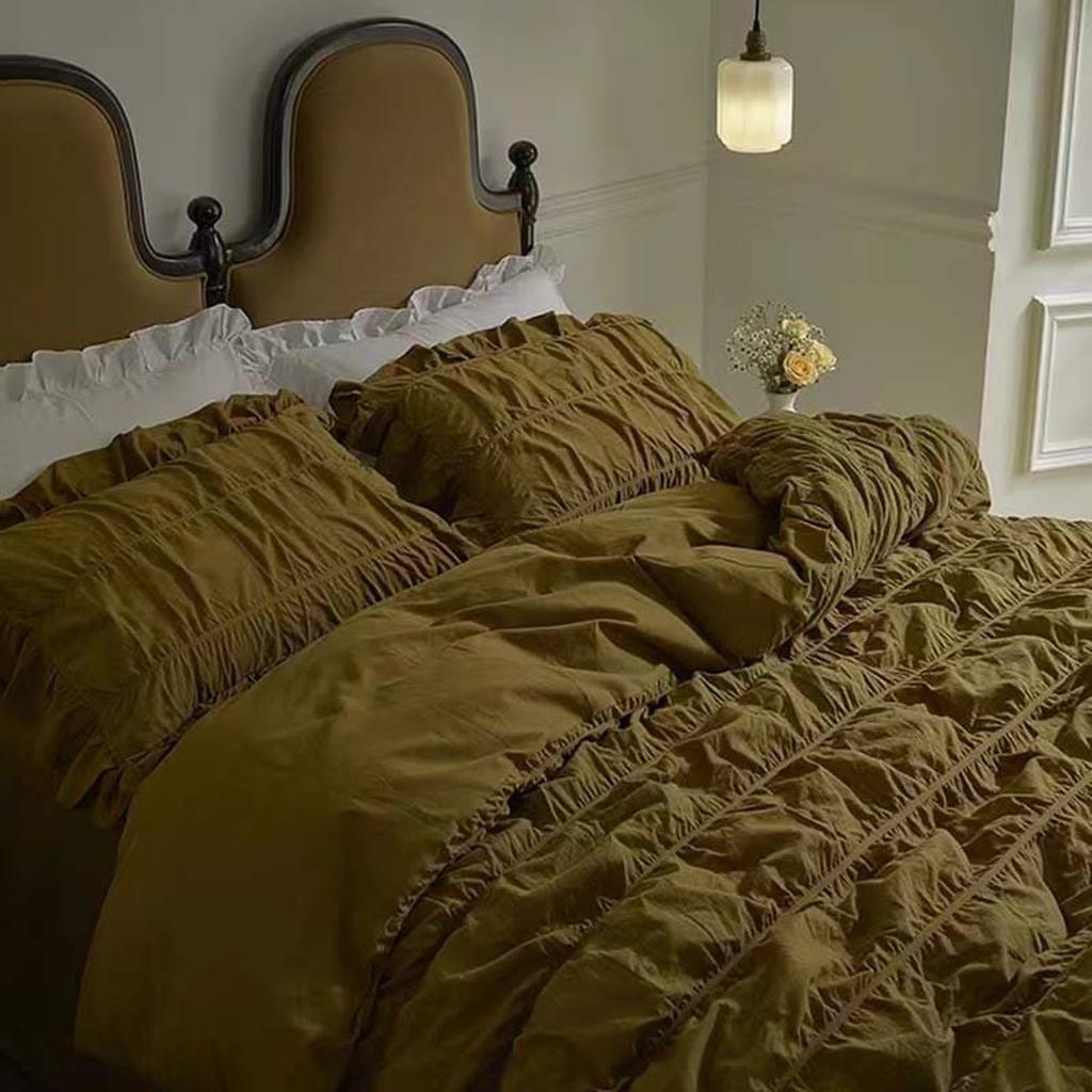 Imagine your bed looking like it's straight out of a classic novel. This set has a deep. rich color and a ruched design that adds a touch of old-school charm. It's perfect if you love a bit of vintage flair and want your bedroom to feel extra cozy and stylish.