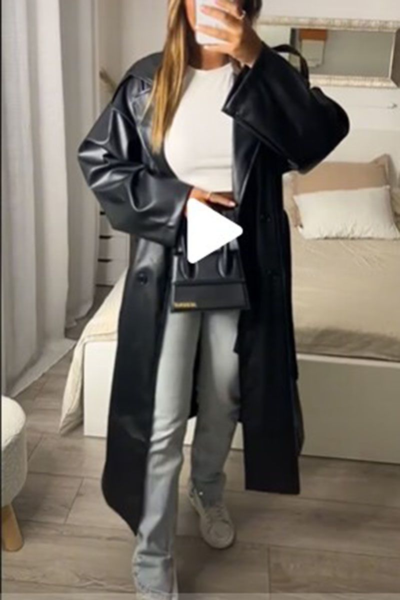 Design: PU Faux Leather. Double Breasted. Belted. Patent Leather. Full Length and Trendy Style.