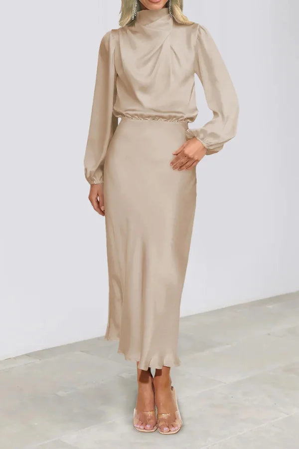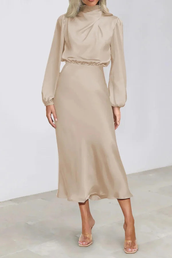 Step into timeless elegance with our Ellana Dress. Crafted from high-quality fabric. this dress exudes refinement and grace. The half turtleneck design adds a touch of sophistication. while the fold detail enhances its unique charm. Perfect for formal occasions or a night out. this dress will effortlessly elevate your style.