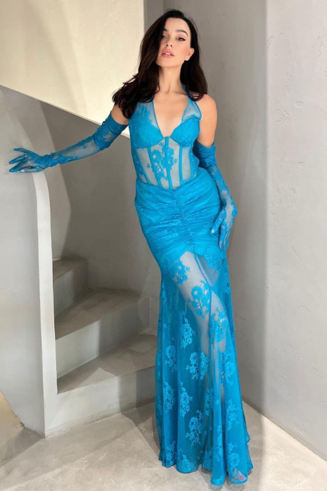Dress With Gloves. Lace Design. Sleeveless. Halterneck Style. Maxi Length.