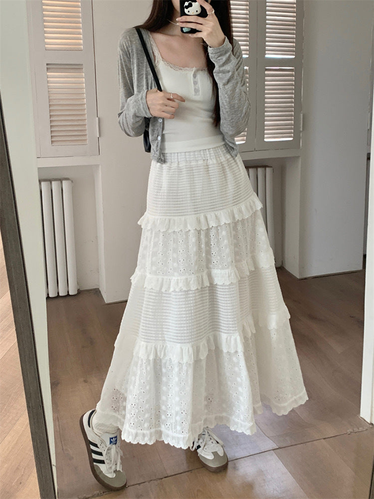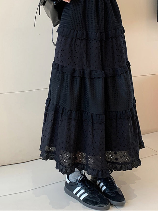 Crafted from premium fabric this skirt exudes sophistication featuring tiers of delicate lacework and eyelet details.