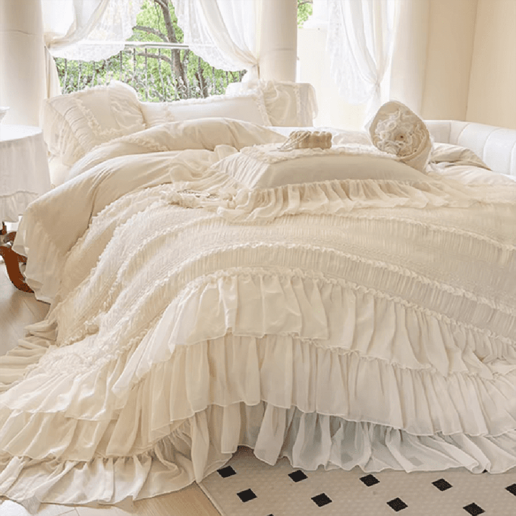 Ready to level up your sleep game? Meet the cream fairy bedding set. The chiffon ruffles give it that fairy-tale flair that turns your bed into a Insta-worthy dreamscape. Made from 100% cotton. this set is ultra soft and breathable.