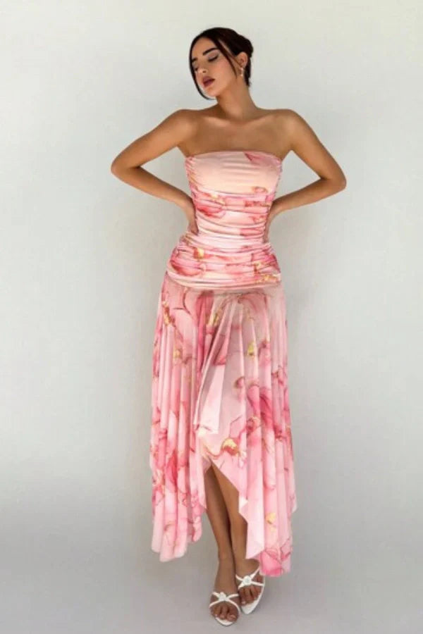 The Floretta dress is a stunning blend of casual and chic. designed for effortless style. Featuring a knitted bodice with a strapless neckline. this dress showcases a delicate floral mesh overlay with a soft pink hue. The asymmetrical hem adds a touch of modern sophistication. while the slim fit highlights your silhouette. Perfect for garden parties. brunches. or casual evening outings. the Floretta dress pairs beautifully with strappy sandals or minimalist heels.