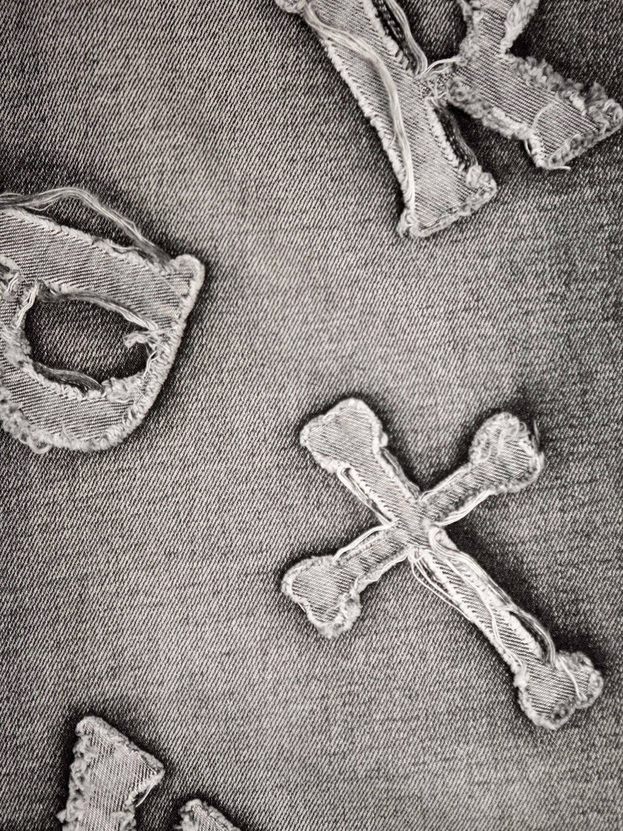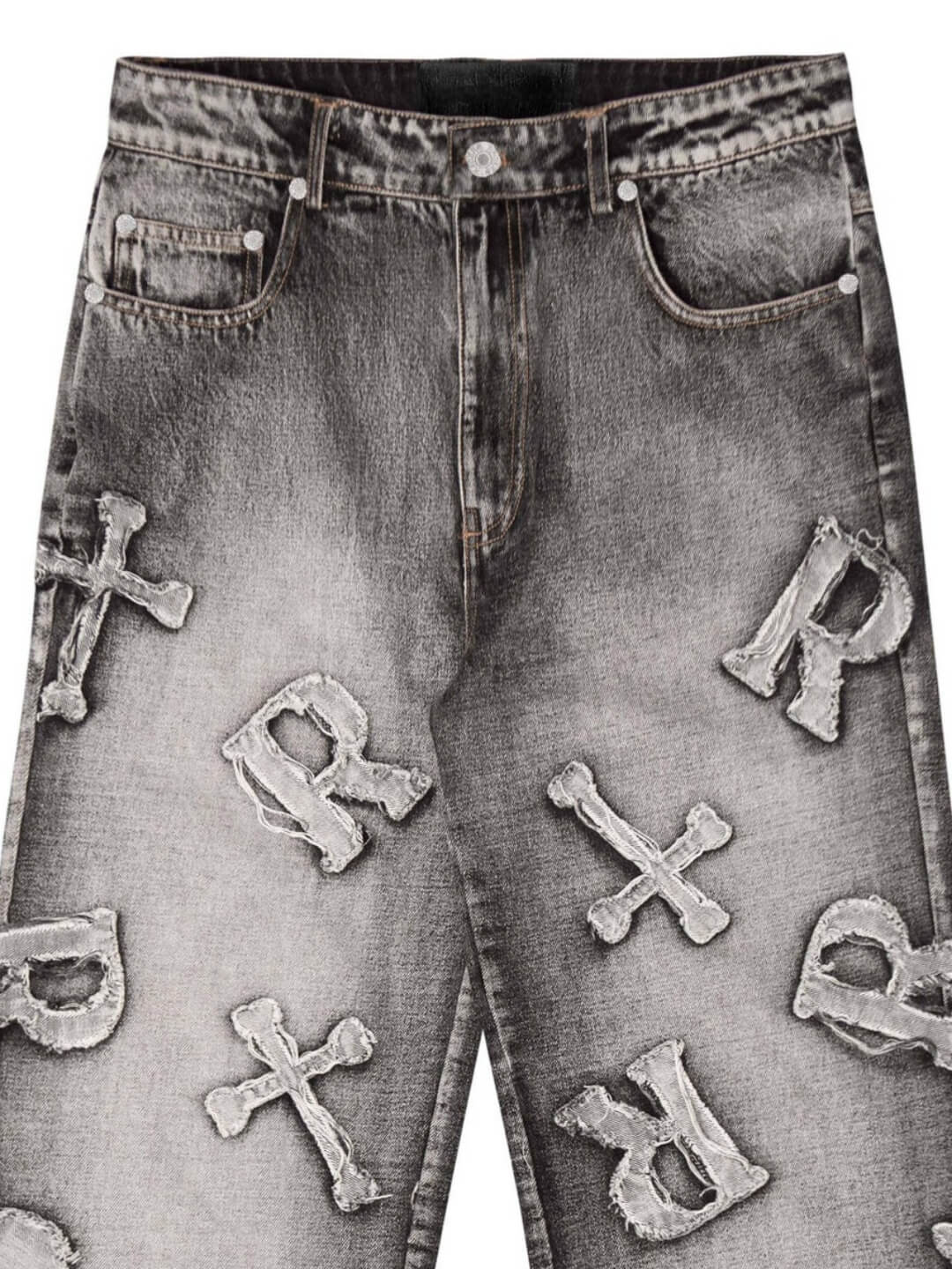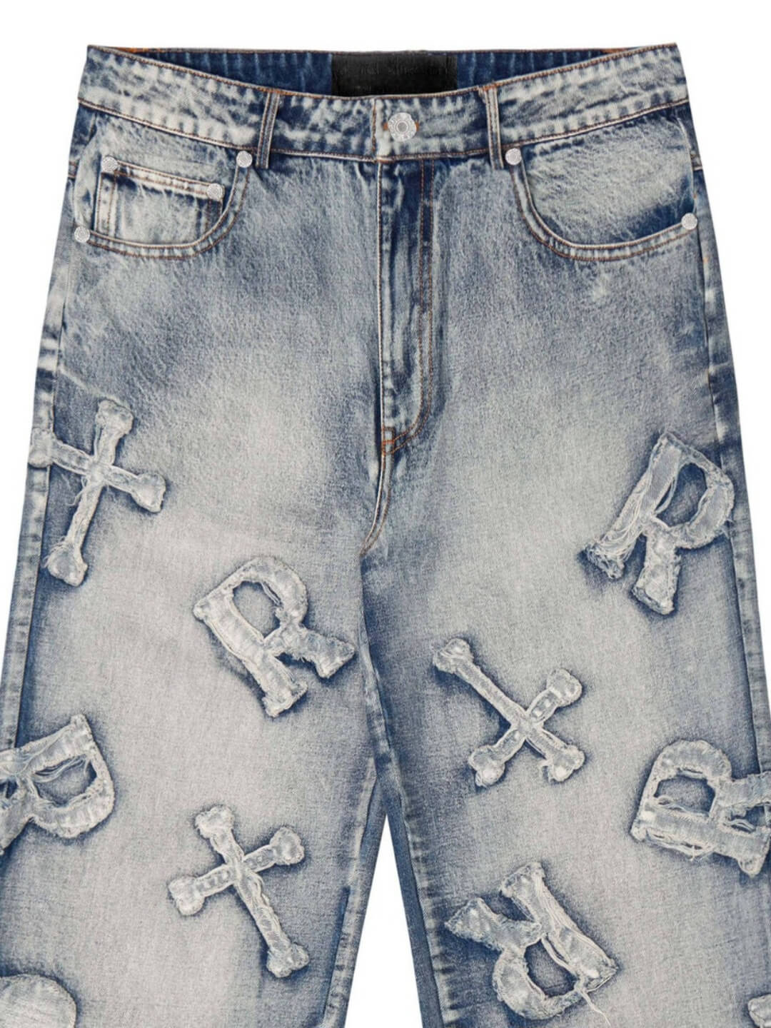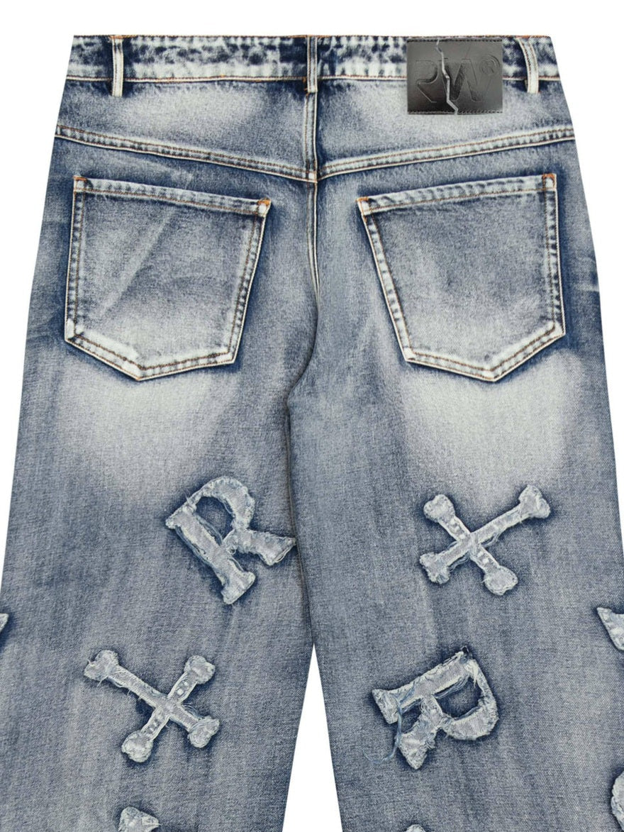 This washed patch jeans has a loose-fit with distressed inverted denim patches all over. Signature metallic hardware.