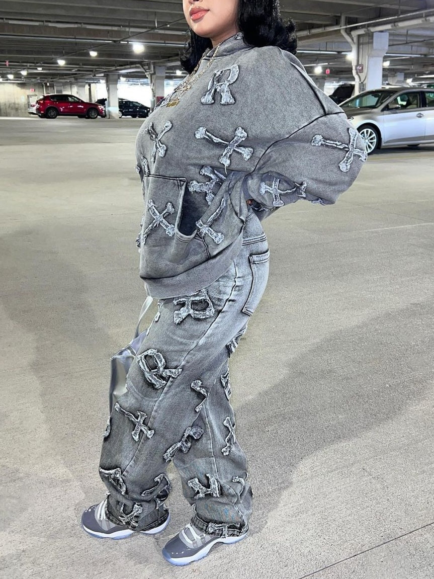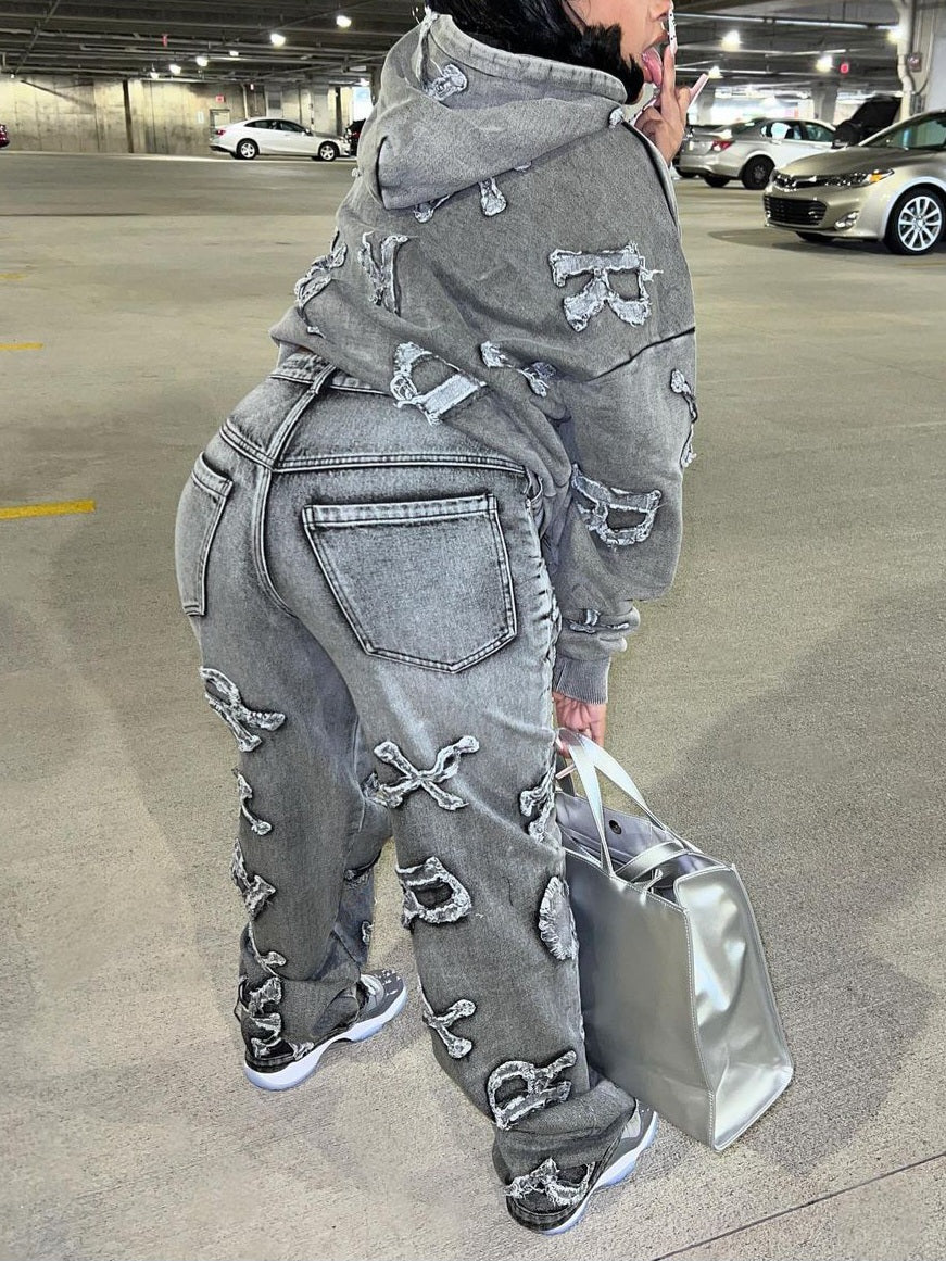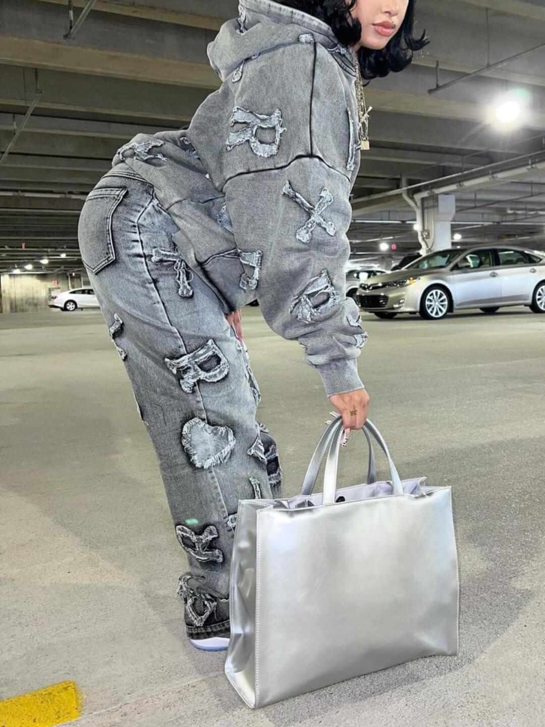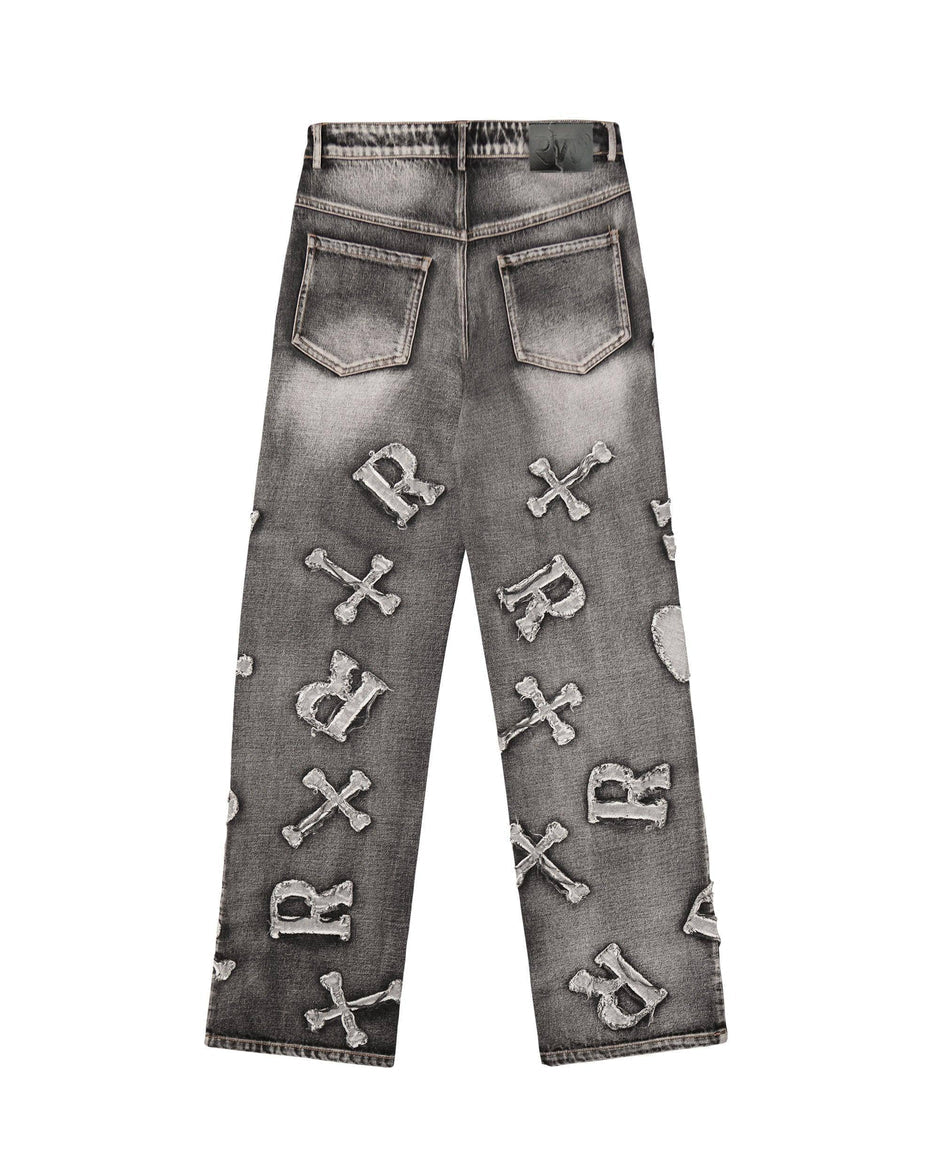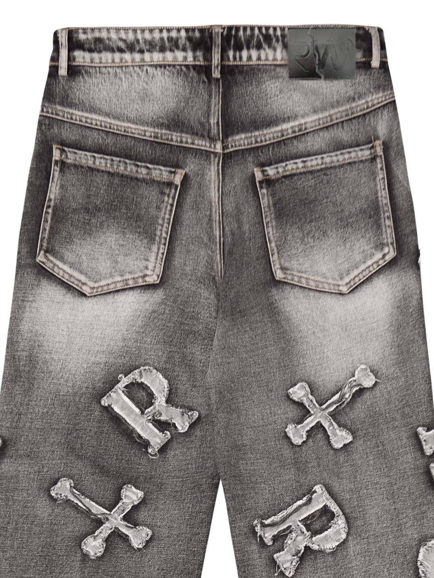 This washed patch jeans has a loose-fit with distressed inverted denim patches all over. Signature metallic hardware.