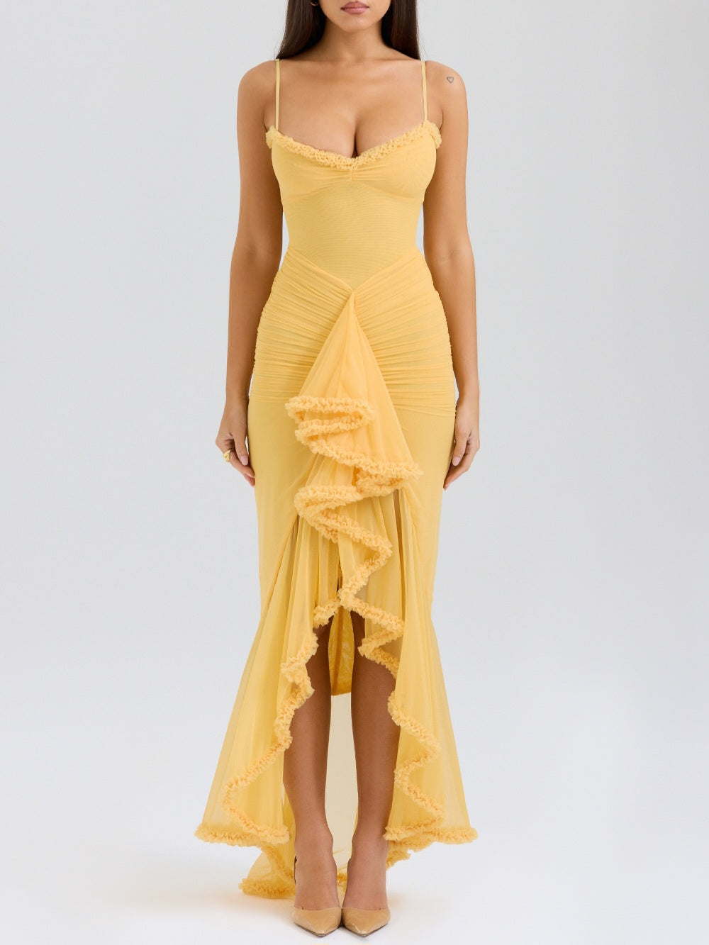 This dress has the most beautiful silhouette perfectly gathered at the hip. It falls to a flirtatious waterfall ruffled front for plenty of drama.