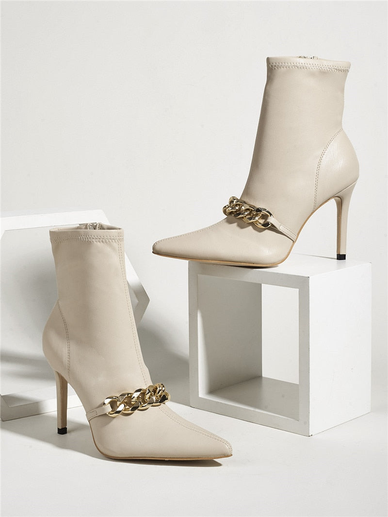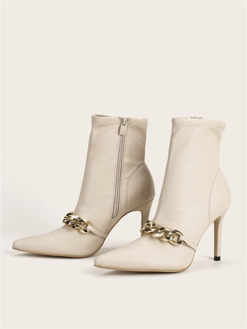 White ankle boots with a pointed-toe design and thin high heels. They feature a golden chain and an interior zipper. Wear from morning to night. with loose pants or a short dress.