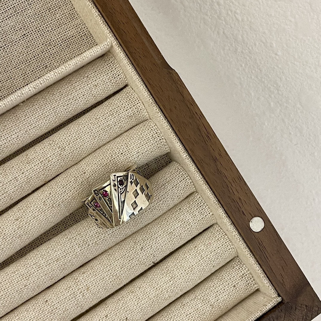 These six Gothic Rings come in a pack. The pack includes a chain ring. heart ring. lightening ring. cards ring. skeleton hand ring. and celestial ring.