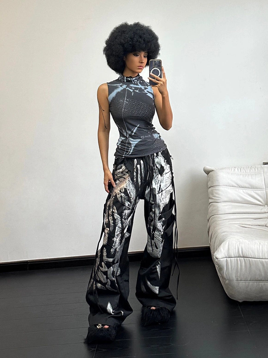 These wide-leg pants are adorned with a silver graffiti-style paintbrush effect throughout. creating a vibrant and artistic appearance.
