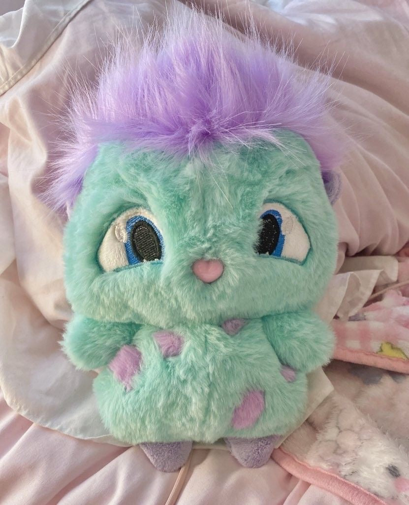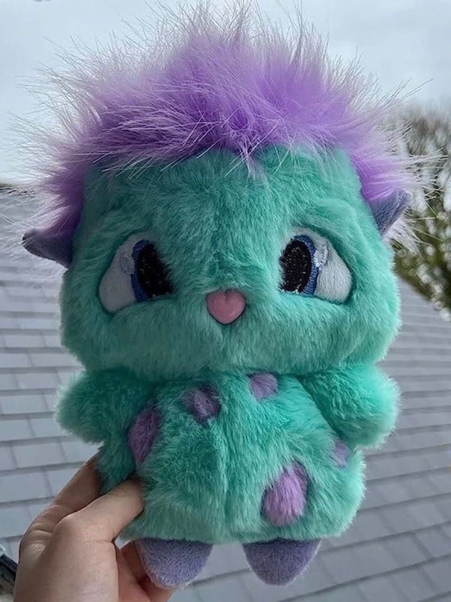 This delightful plush toy is crafted with soft. mint-green fur and accented with whimsical purple spots and hair.