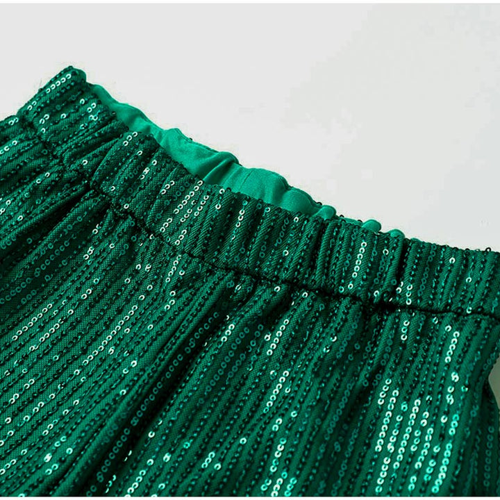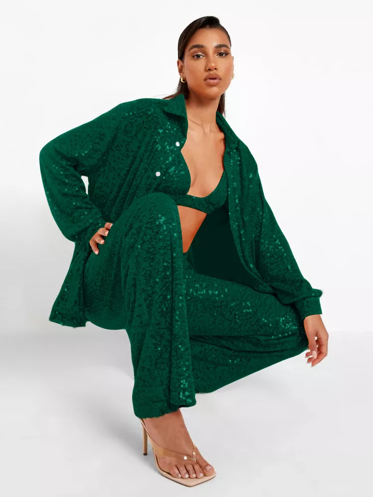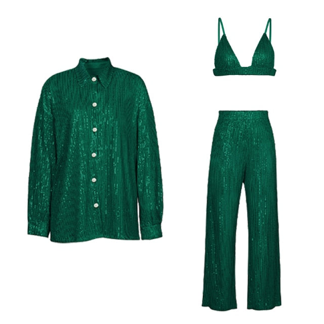 Party season just got a little chicer. This Bright Sequin set consists of a shirt. bralette top. and pants. All made from an ultra-glam sequin-embellished fabric. Wear them separately or as a set.